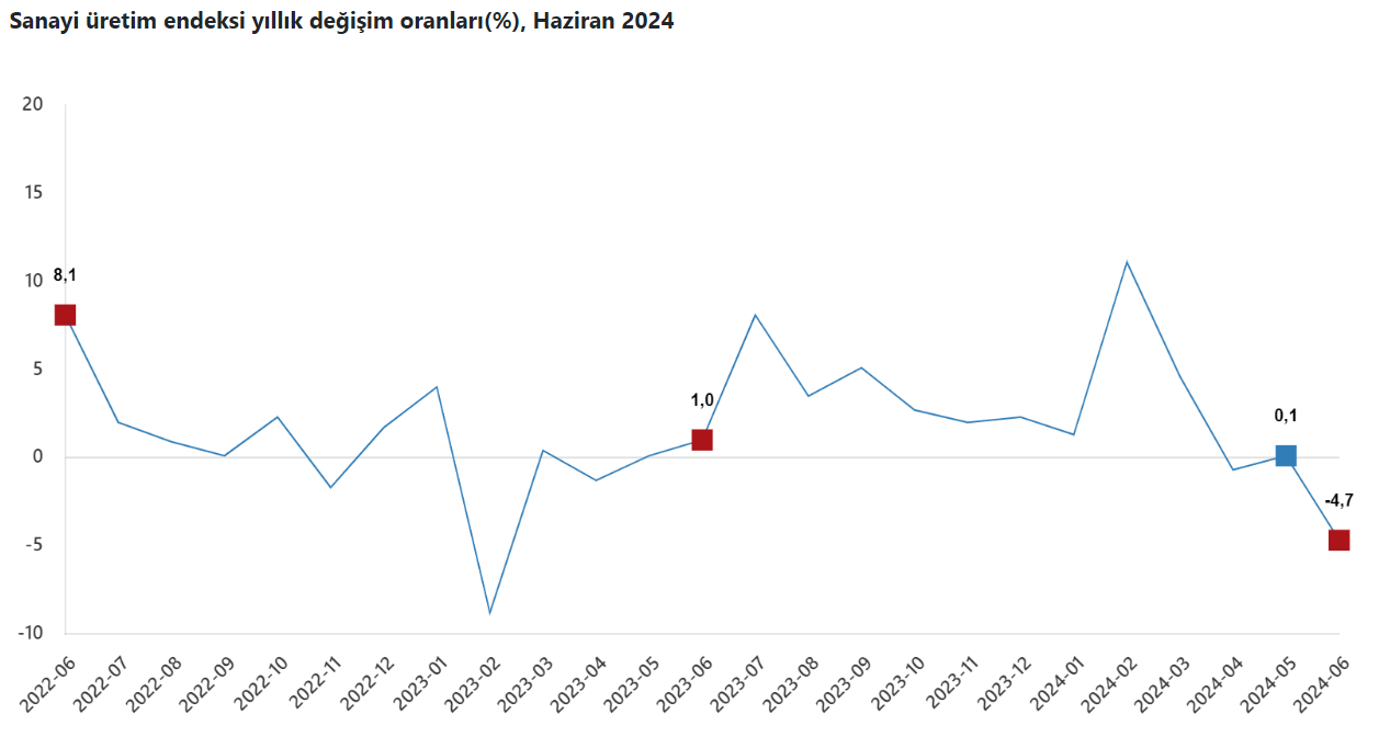 Türkiye İstatistik Kurumu (TÜİK), haziran ayı sanayi üretimi verilerini açıkladı. Büyümenin öncü göstergesi olan sanayi üretimi haziranda aylık bazda aylık bazda yüzde 2,1, yıllık bazda yüzde 4,7 azaldı. Kaynak: TÜİK Sanayi üretimi böylece yıllık bazda Şubat 2023'ten bu yana en büyük düşüşü kaydetti. Sanayinin alt sektörleri incelendiğinde, haziranda madencilik ve taş ocakçılığı sektörü endeksi bir önceki aya göre yüzde 1,8 artarken, imalat sanayi sektörü endeksi yüzde 3,1 azaldı ve elektrik, gaz, buhar ve iklimlendirme üretimi ve dağıtımı sektörü endeksi yüzde 7,8 artış gösterdi. İmalat sektörü son bir yılda yüzde 6,9 daraldı Yıllık bazda bakıldığında madencilik ve taş ocakçılığı sektörü endeksi bir önceki yılın aynı ayına göre yüzde 8,6 artarken, imalat sanayi sektörü endeksi yüzde 6,9 azaldı. Elektrik, gaz, buhar ve iklimlendirme üretimi ve dağıtımı sektörü endeksi yüzde 15,2 arttı. [news_id:741644]