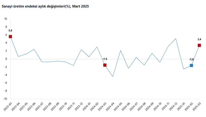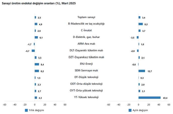 TÜİK verilerine göre sanayi üretimi mart ayında aylık bazda yüzde 3,4, yıllık bazda ise yüzde 2,5 oranında artış kaydetti. Türkiye İstatistik Kurumu (TÜİK) mart ayına ilişkin sanayi üretimi verilerini açıkladı. Büyümenin öncü göstergesi sanayi üretimi aylık yüzde 3,4, yıllık ise yüzde 2,5 artış kaydetti. Kaynak: TÜİK Sanayinin alt sektörleri (2021=100 referans yıllı) incelendiğinde, 2025 yılı Mart ayında madencilik ve taş ocakçılığı sektörü endeksi bir önceki yılın aynı ayına göre %4,9 arttı, imalat sanayi sektörü endeksi %2,0 arttı ve elektrik, gaz, buhar ve iklimlendirme üretimi ve dağıtımı sektörü endeksi %6,1 arttı. Sanayinin alt sektörleri incelendiğinde, 2025 yılı Mart ayında madencilik ve taş ocakçılığı sektörü endeksi bir önceki aya göre %8,2 arttı, imalat sanayi sektörü endeksi %3,7 arttı ve elektrik, gaz, buhar ve iklimlendirme üretimi ve dağıtımı sektörü endeksi %3,5 azaldı. Kaynak: TÜİK