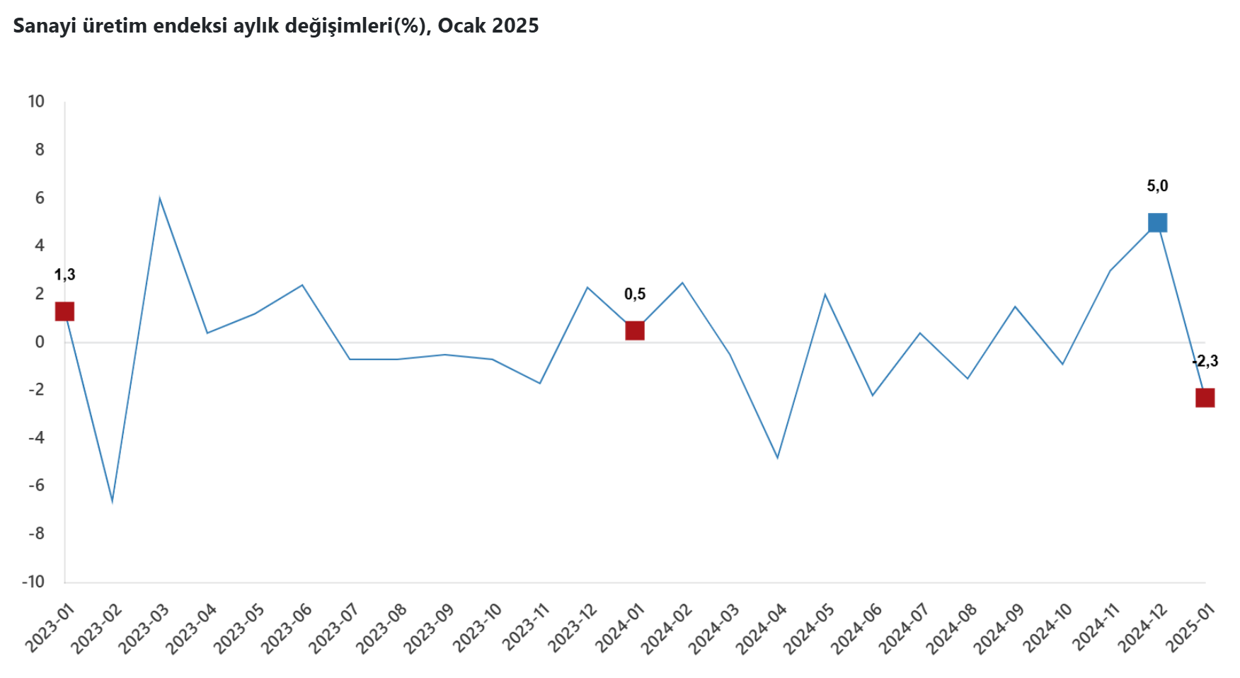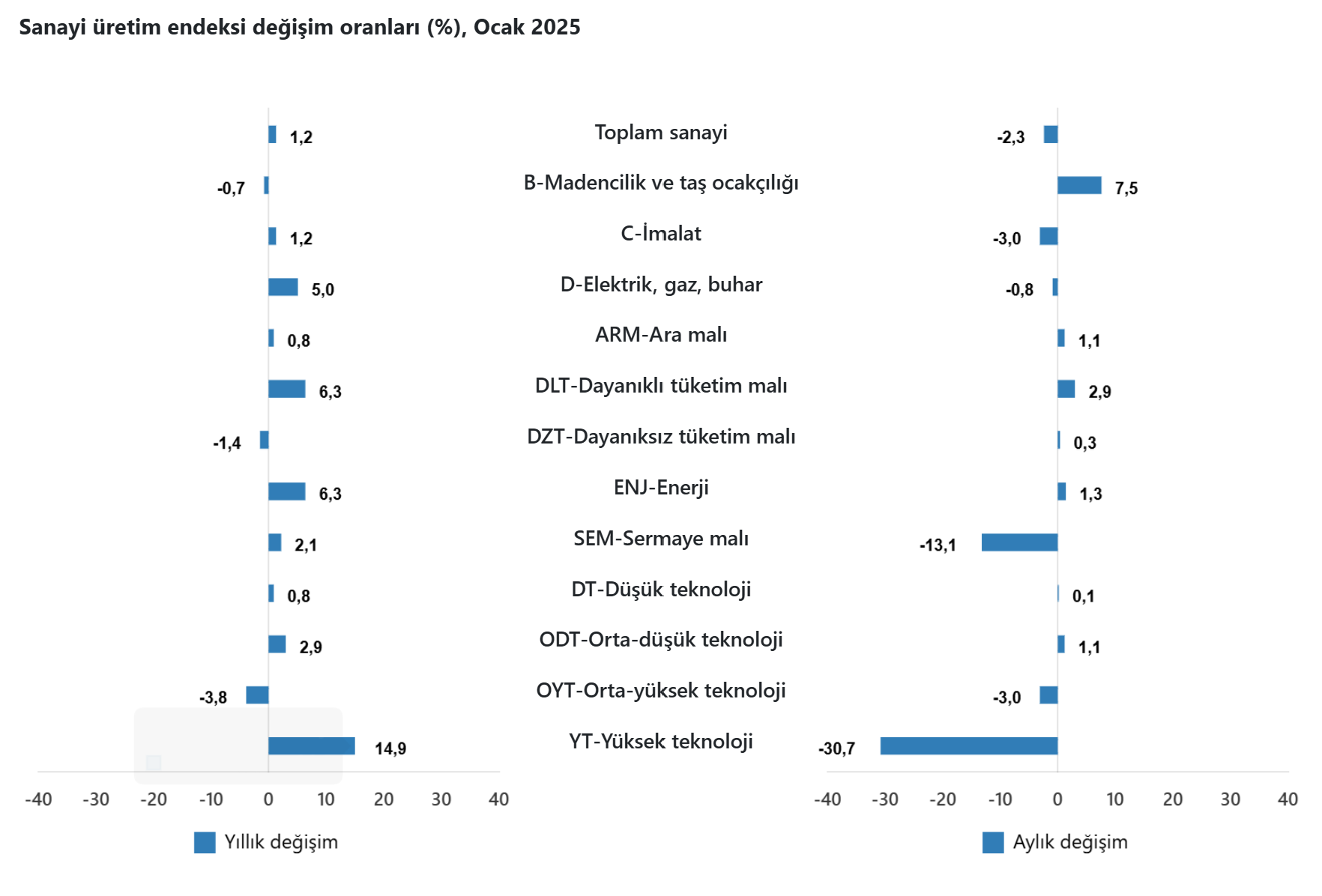 TÜİK verilerine göre sanayi üretimi yeni yıla aylık bazda yüzde 2,3 daralma ile başladı. Türkiye İstatistik Kurumu (TÜİK) 2025 yılının ilk Sanayi Üretim Endeksi verilerini açıkladı. TÜİK verilerine göre sanayi üretimi yıllık bazda yüzde 1,2 artış kaydetti. Sanayi üretimindeki artış geçtiğimiz yılın aralık ayında yıllık bazda yüzde 7 olmuştu. 2025 yılının ocak ayında sanayi üretimi aylık bazda ise yüzde 2,3 azalış kaydetti. Böylelikle aralık ayında yaşanan toparlanmanın ardından açıklanan veri, sanayi üretiminde daralmanın yeniden oluştuğunu gözler önüne serdi. Kaynak: TÜİK Sanayinin alt sektörleri incelendiğinde 2025 yılı ocak ayında madencilik ve taş ocakçılığı sektörü endeksi bir önceki aya göre %7,5 arttı, imalat sanayi sektörü endeksi %3,0 azaldı ve elektrik, gaz, buhar ve iklimlendirme üretimi ve dağıtımı sektörü endeksi %0,8 azaldı. Sanayinin alt sektörleri yıllık bazda incelendiğinde ise 2025 yılı ocak ayında madencilik ve taş ocakçılığı sektörü endeksi bir önceki yılın aynı ayına göre %0,7 azaldı, imalat sanayi sektörü endeksi %1,2 arttı ve elektrik, gaz, buhar ve iklimlendirme üretimi ve dağıtımı sektörü endeksi %5,0 arttı. Kaynak: TÜİK [news_id:754991]