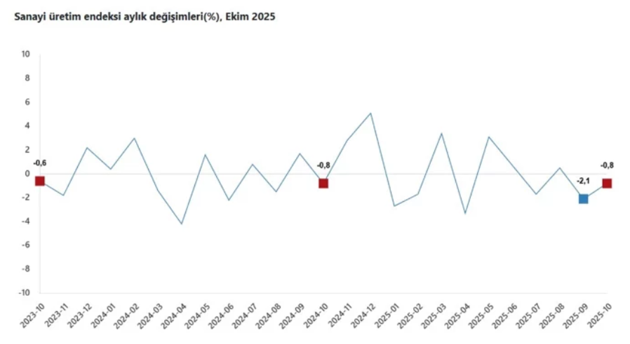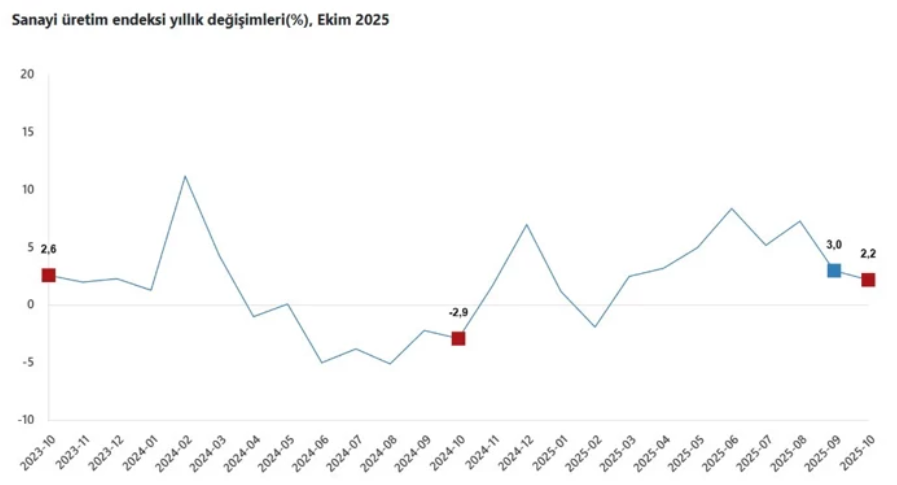 Sanayi üretimi ekimde aylık bazda yüzde 0,8 azalırken yıllık bazda yüzde 2,2 artış kaydetti. Sanayi üretiminde gerçekleşen yıllık artış Şubat 2025'ten bu yana gerçekleşen en düşük artış oldu. Türkiye İstatistik Kurumu (TÜİK) sanayi üretimi verilerini açıkladı. TÜİK verilerine göre sanayi üretimi yıllık bazda yüzde 2,2 arttı. Sanayinin alt sektörleri (2021=100 referans yıllı) incelendiğinde, 2025 yılı Ekim ayında madencilik ve taş ocakçılığı sektörü endeksi bir önceki yılın aynı ayına göre yüzde 9,4 arttı, imalat sanayi sektörü endeksi yüzde 1,9 arttı ve elektrik, gaz, buhar ve iklimlendirme üretimi ve dağıtımı sektörü endeksi yüzde 0,6 arttı. Sanayi üretimi aylık yüzde 0,8 azaldı Sanayinin alt sektörleri incelendiğinde, 2025 yılı Ekim ayında madencilik ve taş ocakçılığı sektörü endeksi bir önceki aya göre yüzde 1,2 arttı, imalat sanayi sektörü endeksi yüzde 0,9 azaldı ve elektrik, gaz, buhar ve iklimlendirme üretimi ve dağıtımı sektörü endeksi yüzde 1,2 azaldı. Kaynak: TÜİK
