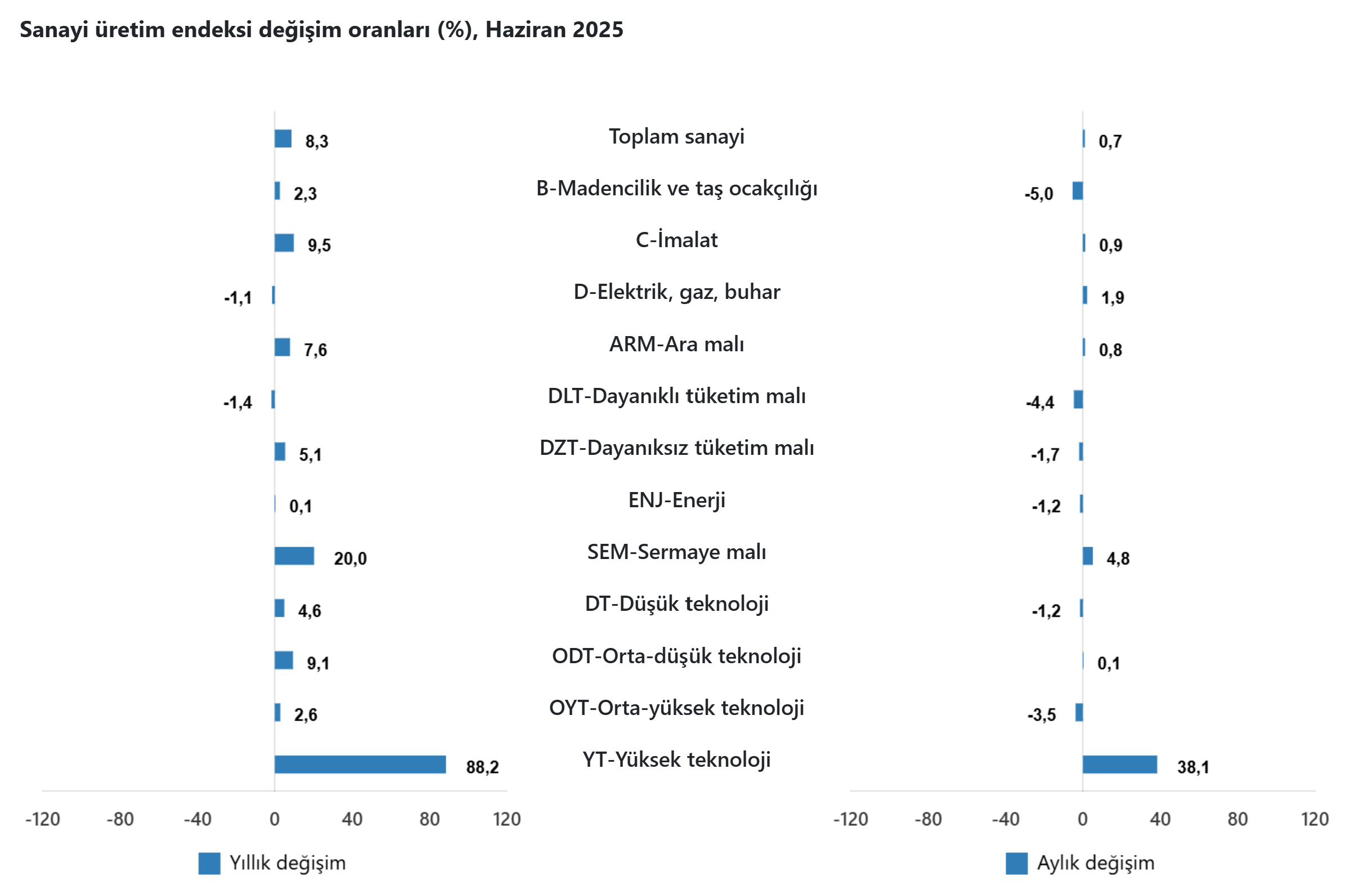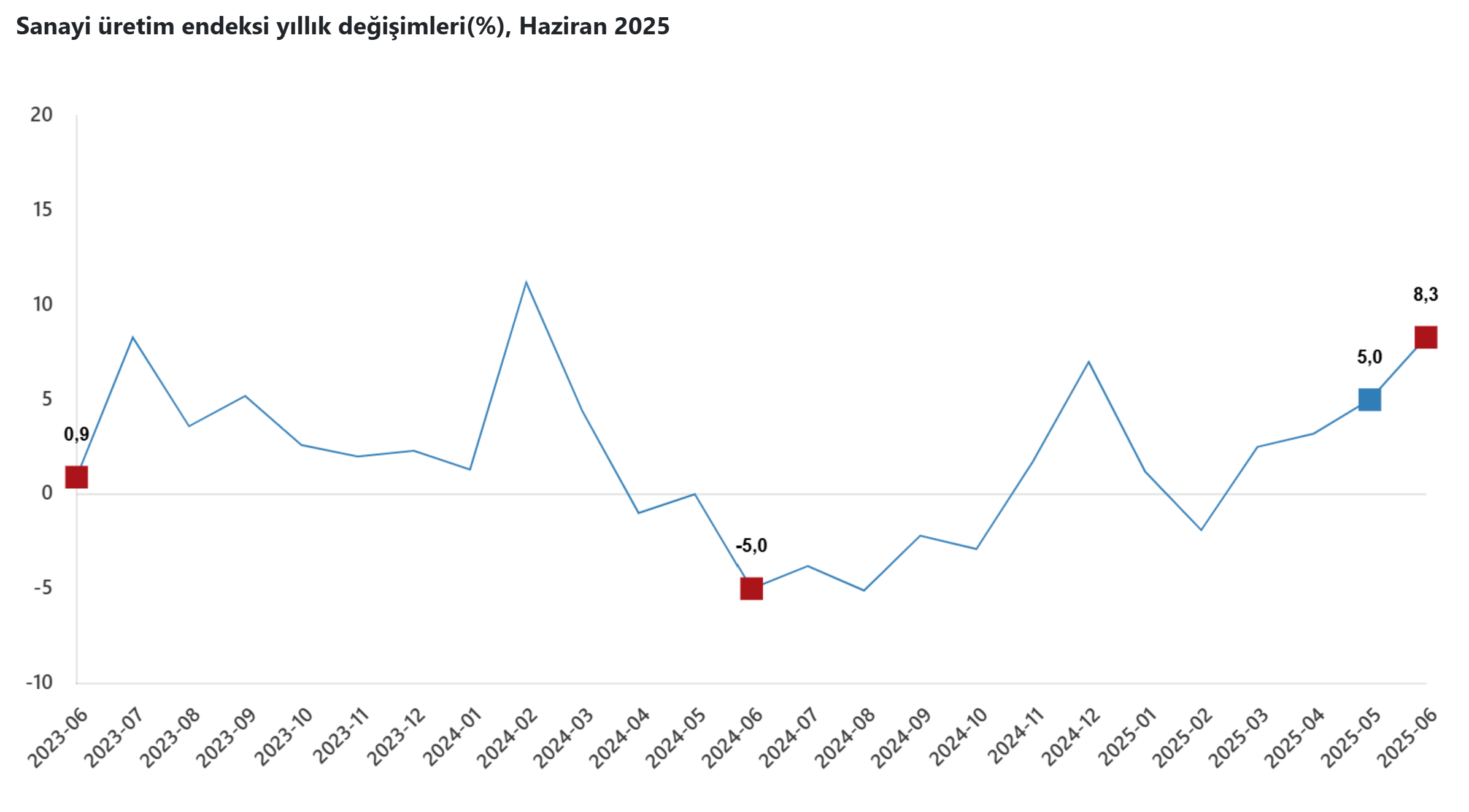 Türkiye İstatistik Kurumu (TÜİK), verilerine göre takvim etkisinden arındırılmış sanayi üretimi, geçen yılın aynı dönemine göre yüzde 8,3 oranında artış gösterdi. Böylelikle sanayi üretiminin artış hızı 16 ayın zirvesine ulaştı. Türkiye İstatistik Kurumu (TÜİK), haziran ayına ilişkin sanayi üretim endeksi verilerini açıkladı. Söz konusu ayda takvim etkisinden arındırılmış sanayi üretimi, geçen yılın aynı ayına kıyasla yüzde 8,3 yükseldi. Sanayinin alt sektörleri incelendiğinde, haziranda madencilik ve taş ocakçılığı sektörü endeksi geçen yılın aynı ayına kıyasla yüzde 2,3, imalat sanayi sektörü endeksi yüzde 9,5 artarken, elektrik, gaz, buhar ve iklimlendirme üretimi ve dağıtımı sektörü endeksi ise yüzde 1,1 düştü. Arındırılmamış sanayi üretim endeksinde yıllık bazda yüzde 9,16 artış gerçekleşti. Aylık veriler Mevsim ve takvim etkisinden arındırılmış sanayi üretimi, söz konusu ayda bir önceki aya kıyasla yüzde 0,7 artış gösterdi. Sanayinin alt sektörleri incelendiğinde, haziranda madencilik ve taş ocakçılığı sektörü endeksi bir önceki aya göre yüzde 5 azalırken, imalat sanayi sektörü endeksi yüzde 0,9, elektrik, gaz, buhar ve iklimlendirme üretimi ve dağıtımı sektörü endeksi 1,9 artış kaydetti.