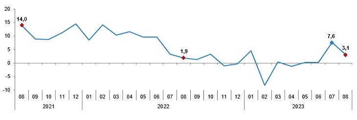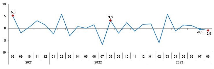 TÜİK verilerine göre sanayi üretimi ağustosta bir önceki aya göre yüzde 0,8 daralma kaydetti. Böylelikle sanayi üretimindeki daralma ikinci aya taşındı. Türkiye İstatistik Kurumu (TÜİK) ağustos ayına ilişkin sanayi üretim endeksini yayımladı. Buna göre sanayi üretimi, ağustosta bir önceki aya göre yüzde 0,8 daralma kaydetti. Temmuz ayında sanayi üretiminde aylık yüzde 0,3'lük daralma izlenmişti. Böylelikle ikinci ayında da sanayi üretiminde aylık düşüş görüldü. Kaynak: TÜİK Ekonomistlerin beklentisi ise sanayi üretiminde aylık yüzde 1'lik büyüme olması yönündeydi. Yıllık olarak bakıldığında ağustosta sanayi üretiminde yüzde 3,1'lik artış kaydedildi. Ekonomstlerin beklentisi ise yüzde 5'lik artış olarak belirlenmişti. Kaynak: TÜİK