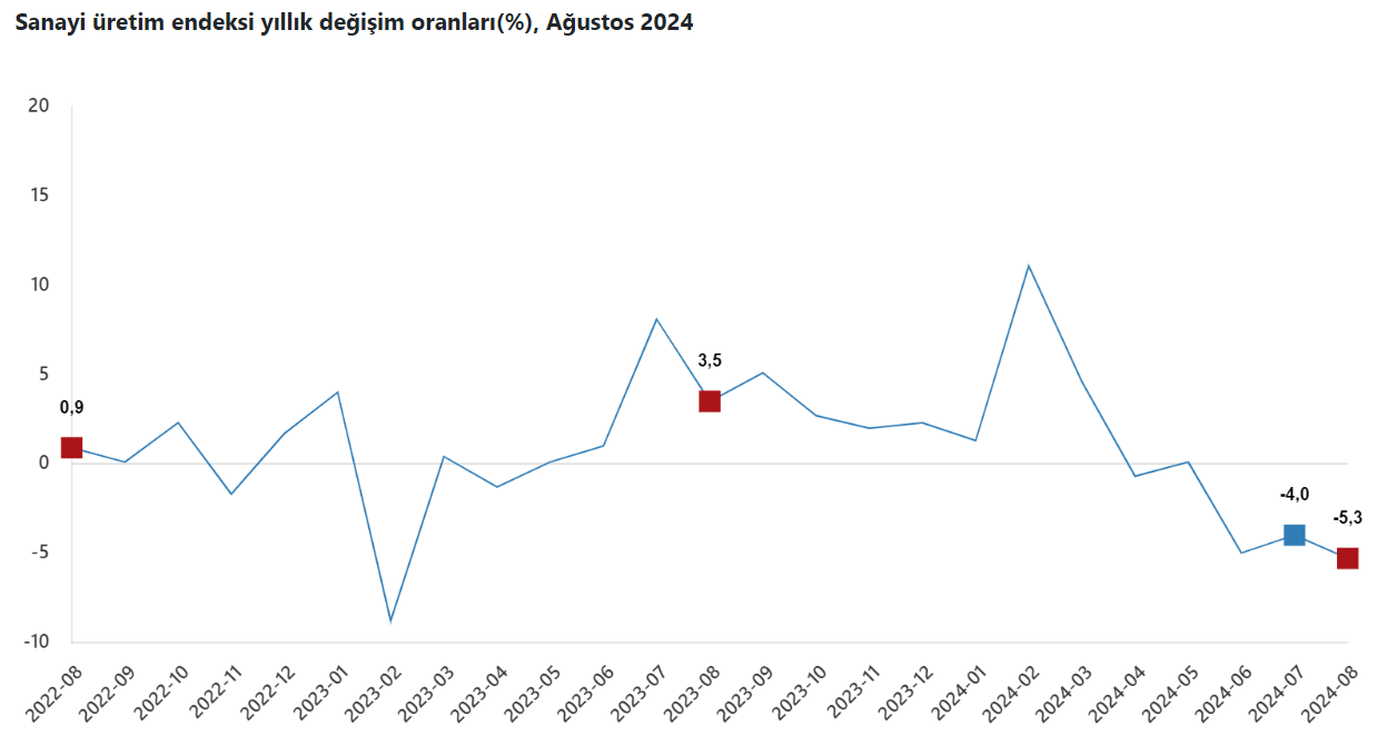 Türkiye İstatistik Kurumu, ağustos ayına ait sanayi üretimin endeksi verilerini açıkladı. TÜİK verilerine göre sanayi üretiminin bir önceki yıla göre değişimi eksi yüzde 5,3 oldu. Yıllık daralış Şubat 2023'ten beri en düşük seviyesine geldi. Kaynak: TÜİK Aylık olarak ise ağustosta üretim bir önceki aya göre yüzde 1,6 azaldı. Sanayinin alt sektörleri incelendiğinde, 2024 yılı Ağustos ayında madencilik ve taş ocakçılığı sektörü endeksi bir önceki yılın aynı ayına göre yüzde 5,4 azaldı, imalat sanayi sektörü endeksi yüzde 5,4 azaldı ve elektrik, gaz, buhar ve iklimlendirme üretimi ve dağıtımı sektörü endeksi yüzde 1,6 arttı. Sanayinin alt sektörleri incelendiğinde, 2024 yılı Ağustos ayında madencilik ve taş ocakçılığı sektörü endeksi bir önceki aya göre yüzde 4,4 azaldı, imalat sanayi sektörü endeksi yüzde 1,3 azaldı ve elektrik, gaz, buhar ve iklimlendirme üretimi ve dağıtımı sektörü endeksi yüzde 3,2 azaldı. Eylül ayına ilişkin Sanayi Üretim Endeksi verileri 11 Kasım 2024 tarihinde yayımlanacak. [news_id:748717]