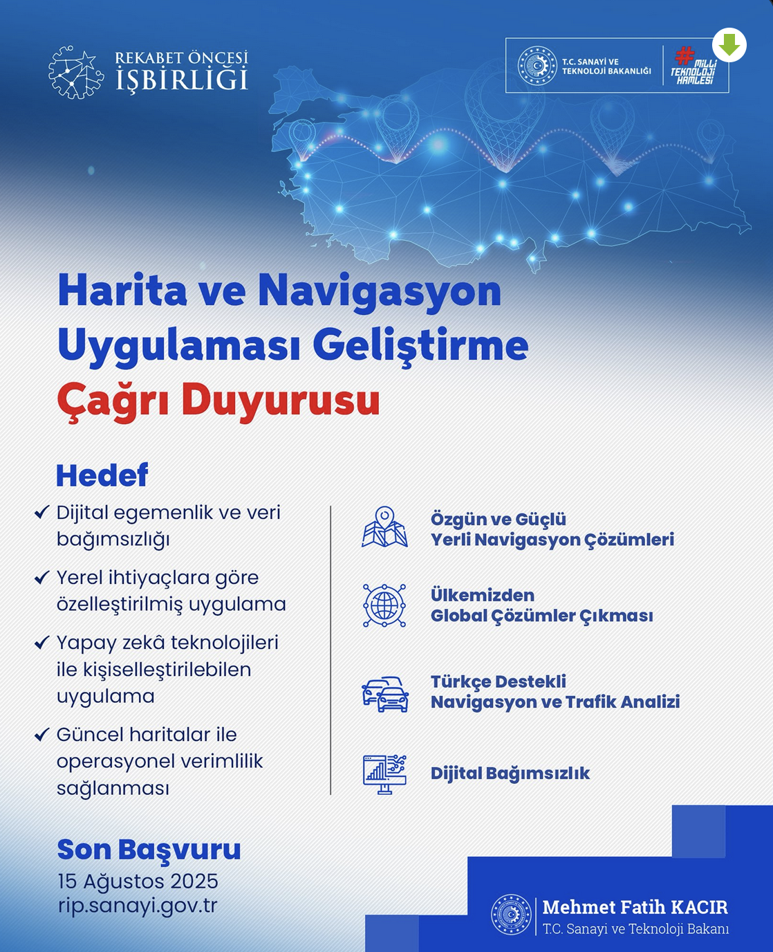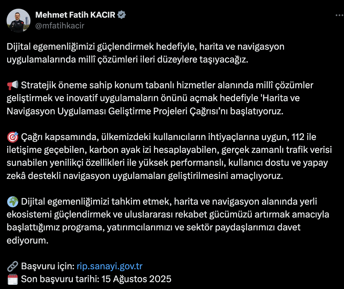 Sanayi ve Teknoloji Bakanı Mehmet Fatih Kacır, dijital egemenliğin güçlendirilmesi amacıyla konum tabanlı hizmetlerde yerli çözümlerin geliştirilmesini hedefleyen yeni bir çağrının başlatıldığını duyurdu. “Harita ve Navigasyon Uygulaması Geliştirme Projeleri Çağrısı” ile yapay zeka destekli, yüksek performanslı ve kullanıcı dostu uygulamaların destekleneceği açıklandı. Sanayi ve Teknoloji Bakanı Mehmet Fatih Kacır, sosyal medya hesabından yaptığı açıklamada, Türkiye'nin dijital egemenliğini pekiştirmek ve stratejik öneme sahip konum tabanlı hizmetlerde bağımsızlığı artırmak amacıyla yeni bir proje çağrısı başlattıklarını bildirdi. Kacır, “Stratejik öneme sahip konum tabanlı hizmetler alanında milli çözümler geliştirilmesi ve inovatif uygulamaların önünün açılması hedefiyle ‘Harita ve Navigasyon Uygulaması Geliştirme Projeleri Çağrısı’nı başlattıklarını” belirtti. Açıklamasında, dijital egemenlik kavramına vurgu yapan Kacır, şu ifadeleri kullandı: “Çağrı kapsamında, ülkemizdeki kullanıcıların ihtiyaçlarına uygun, 112 ile iletişime geçebilen, karbon ayak izi hesaplayabilen, gerçek zamanlı trafik verisi sunabilen, yenilikçi özellikleriyle yüksek performanslı, kullanıcı dostu ve yapay zeka destekli navigasyon uygulamaları geliştirilmesini amaçlıyoruz. Dijital egemenliğimizi tahkim etmek, harita ve navigasyon alanında yerli ekosistemi güçlendirmek ve uluslararası rekabet gücümüzü artırmak amacıyla başlattığımız programa, yatırımcılarımızı ve sektör paydaşlarımızı davet ediyorum.” Başvurular 15 Ağustos’a Kadar Yapılabilecek Bakan Kacır’ın açıklamasında yer alan bilgilere göre, “Harita ve Navigasyon Uygulaması Geliştirme Projeleri Çağrısı”na ilişkin başvurular 15 Ağustos 2025 tarihine kadar “http://rip.sanayi.gov.tr” internet adresi üzerinden alınacak. Proje çağrısıyla, yalnızca konum hizmetlerinde yerlileşmenin değil, aynı zamanda yapay zeka tabanlı kişiselleştirme, dijital veri bağımsızlığı ve operasyonel verimlilik gibi temel alanlarda da güçlü yerli teknolojilerin geliştirilmesi hedefleniyor. Çağrının Hedefi: Milli Teknoloji, Küresel Rekabet Başlatılan programın temel hedefleri arasında, uluslararası navigasyon uygulamalarına karşı rekabet gücü taşıyabilecek düzeyde, yerli teknoloji temelli çözümlerin geliştirilmesi öne çıkıyor. Proje çağrısı, kullanıcı deneyimi ve teknolojik yeterliliği önceleyen, karbon salınımı farkındalığı yaratabilecek çevresel duyarlılık içeren, yapay zeka destekli yazılım projelerini desteklemeyi amaçlıyor. Bu bağlamda, dijital bağımsızlık ve sürdürülebilir teknoloji yaklaşımı merkeze alınıyor.