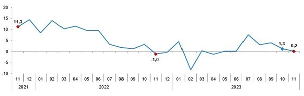 TÜİK verilerine göre kasım ayında sanayi üretimi bir önceki yılın aynı ayına göre yüzde 0,2 artarken, ekim ayına göre yüzde 1,4 azaldı oranında geriledi. Türkiye İstatistik Kurumu (TÜİK) kasım ayına ilişkin sanayi üretimi verilerini yayımladı. Buna göre, sanayi üretimi kasım ayında aylık bazda yüzde 1,4 oranında azalırken yıllık bazda yüzde 0,2 arttı. Ekim ayında sanayi üretimi aylık bazda yüzde 0,4 oranında azalırken yıllık bazda yüzde 1,1 artmıştı. Sanayi üretim endeksi yıllık değişim oranları (%), Kasım 2023 Kaynak: TÜİK Alt sektörler Sanayinin alt sektörleri (2015=100 referans yıllı) incelendiğinde, 2023 yılı Kasım ayında madencilik ve taş ocakçılığı sektörü endeksi bir önceki yılın aynı ayına göre yüzde 3,5, imalat sanayi sektörü endeksi yüzde 0,1 ve elektrik, gaz, buhar ve iklimlendirme üretimi ve dağıtımı sektörü endeksi yüzde 4,5 arttı. Sanayinin alt sektörleri incelendiğinde, 2023 yılı Kasım ayında madencilik ve taş ocakçılığı sektörü endeksi bir önceki aya göre yüzde 4,5, imalat sanayi sektörü endeksi yüzde 1,3 ve elektrik, gaz, buhar ve iklimlendirme üretimi ve dağıtımı sektörü endeksi yüzde 1,0 azaldı.