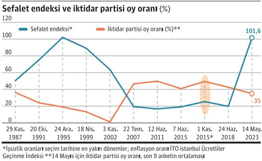 Demokratik yollarla belirlenen iktidar değişikliklerinde pek çok etken olsa da ekonomik konjonktür bu faktörlerin başlıcaları arasında gösteriliyor. Peki sefalet endeksi, seçimleri ne ölçüde etkiliyor? Ekonomim’den Talip Aktaş’ın haberine göre, toplumsal dokuda en geniş şekilde temsil edilen grubun çıkarının ne ölçüde korunup korunmadığı, iktidarın da notunu belirliyor. Geniş kesimlerin çıkarını etkileyen iktisadi faktörler ise genelde iki temel sorunla ölçülüyor; hayat pahalılığı (enflasyon) ve işsizlik… Bu iki kavramın toplamı ise ekonomide “Sefalet Endeksi” olarak adlandırılıyor. Sefalet Endeksi’nin yükselmesi, mevcut iktidardan hoşnutsuzluğa ve genellikle de seçim döneminde iktidar değişimine yol açarken, düşmesi ise iktidar partisine desteğin devamı yönünde seçmen tercihi oluşturuyor. Türkiye’nin 2001 yılında yaşadığı derin ekonomik kriz ve yol açtığı ani yoksullaşma, Sefalet Endeksi ile iktidar ilişkisini en çarpıcı şekilde ortaya koyan örnek olarak hafızalardaki yerini hâlâ koruyor. İşsizlik ve özellikle enflasyonun zirve yaptığı 2001 krizini izleyen 2002 seçimlerinde de iktidar ortağı her üç parti de (DSP, ANAP, MHP) barajı geçemeyip Meclis dışında kalırken, seçmen yeni kurulmuş olan bir partiyi (AK Parti) tek başına iktidara taşımıştı. Kaynak: Talip Aktaş Yukarıdaki tabloda görülen veriler de sefalet endeksinin, Türkiye’deki seçimlerle anlamlı bir ilişki içinde bulunduğuna işaret ediyor. Buna göre, 3 Kasım 2002 seçimlerinden bu yana iktidar partisi değişmese de, işsizlik ve özellikle enflasyondaki değişimin, iktidarın seçimlerde aldığı oy oranını etkilediği oldukça açık bir şekilde görülüyor. Bu etkinin tek istisnası ise 7 Haziran 2015’teki seçimin yenilendiği 1 Kasım 2015 seçimleri olarak göze çarpıyor. Bu dönemde ekonomideki olumsuz performanstan bağımsız olarak iki seçim arasında yaşanan terör saldırılarıyla ön plana çıkan “güvenlik” kaygısının, oy-Sefalet Endeksi arasındaki korelasyonu bozduğu düşünülüyor. Tıklayın: TL'nin volatilitesi, dünyadaki tüm para birimlerini geride bıraktı
