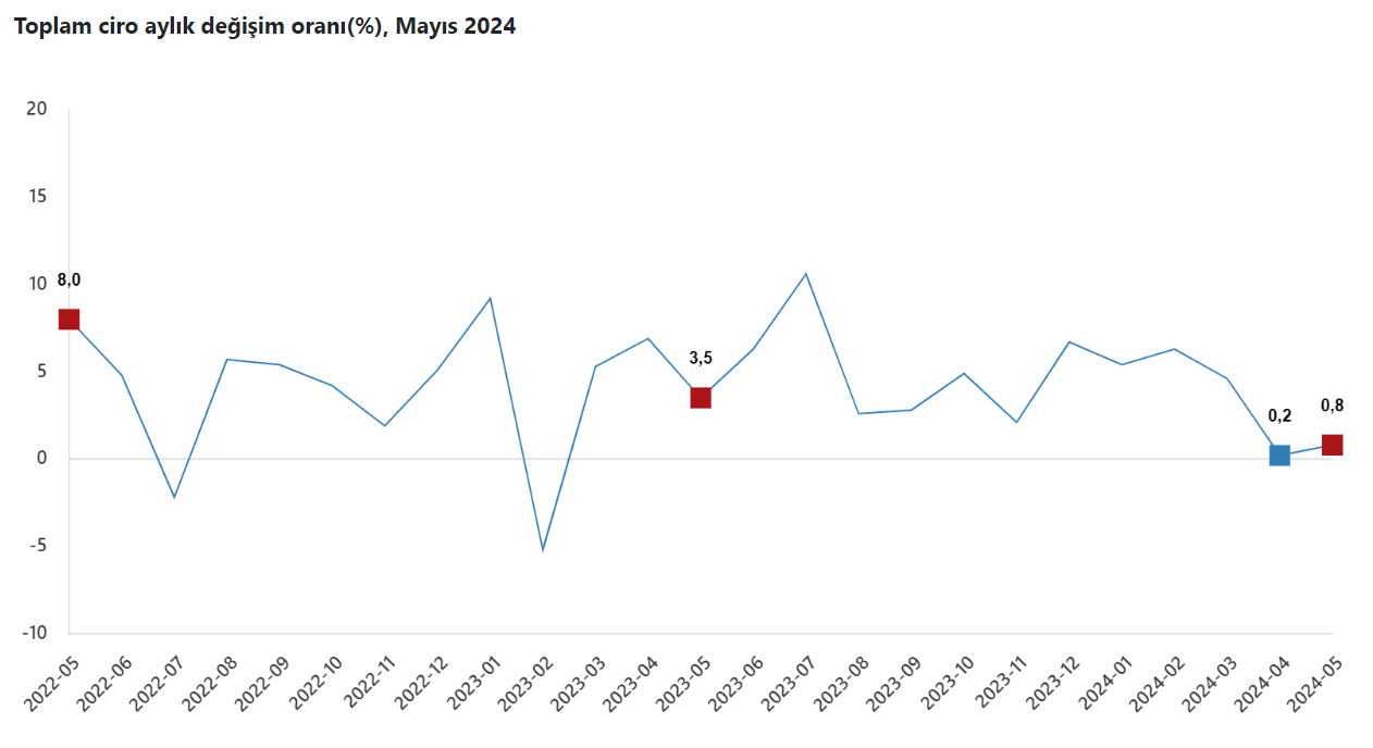 TÜİK verilerine göre, sektörlerin toplam ciroları mayısta yıllık yüzde 66,8, aylık yüzde 0,8 arttı. TÜİK, 2024 yılı mayıs ayının toplam ciro endekslerini açıkladı. Sanayi, inşaat, ticaret ve hizmet sektörleri toplamında ciro endeksi (2021=100), 2024 yılı Mayıs ayında yıllık yüzde 66,8 arttı. Toplam cironun alt detaylarına bakıldığında; 2024 yılı Mayıs ayında yıllık sanayi sektörü ciro endeksi yüzde 60,4 arttı, inşaat ciro endeksi yüzde 87,4 arttı, ticaret ciro endeksi yüzde 65,1 arttı, hizmet ciro endeksi yüzde 80,6 arttı. Toplam ciro aylık yüzde 0,8 arttı Sanayi, inşaat, ticaret ve hizmet sektörleri toplamında ciro endeksi (2021=100), 2024 yılı mayıs ayında aylık yüzde 0,8 arttı. Toplam cironun alt detaylarına bakıldığında; 2024 yılı mayıs ayında aylık sanayi sektörü ciro endeksi yüzde 1,5 arttı, inşaat ciro endeksi yüzde 5,7 arttı, ticaret ciro endeksi yüzde 0,7 azaldı, hizmet ciro endeksi yüzde 3,4 arttı. Kaynak: TÜİK