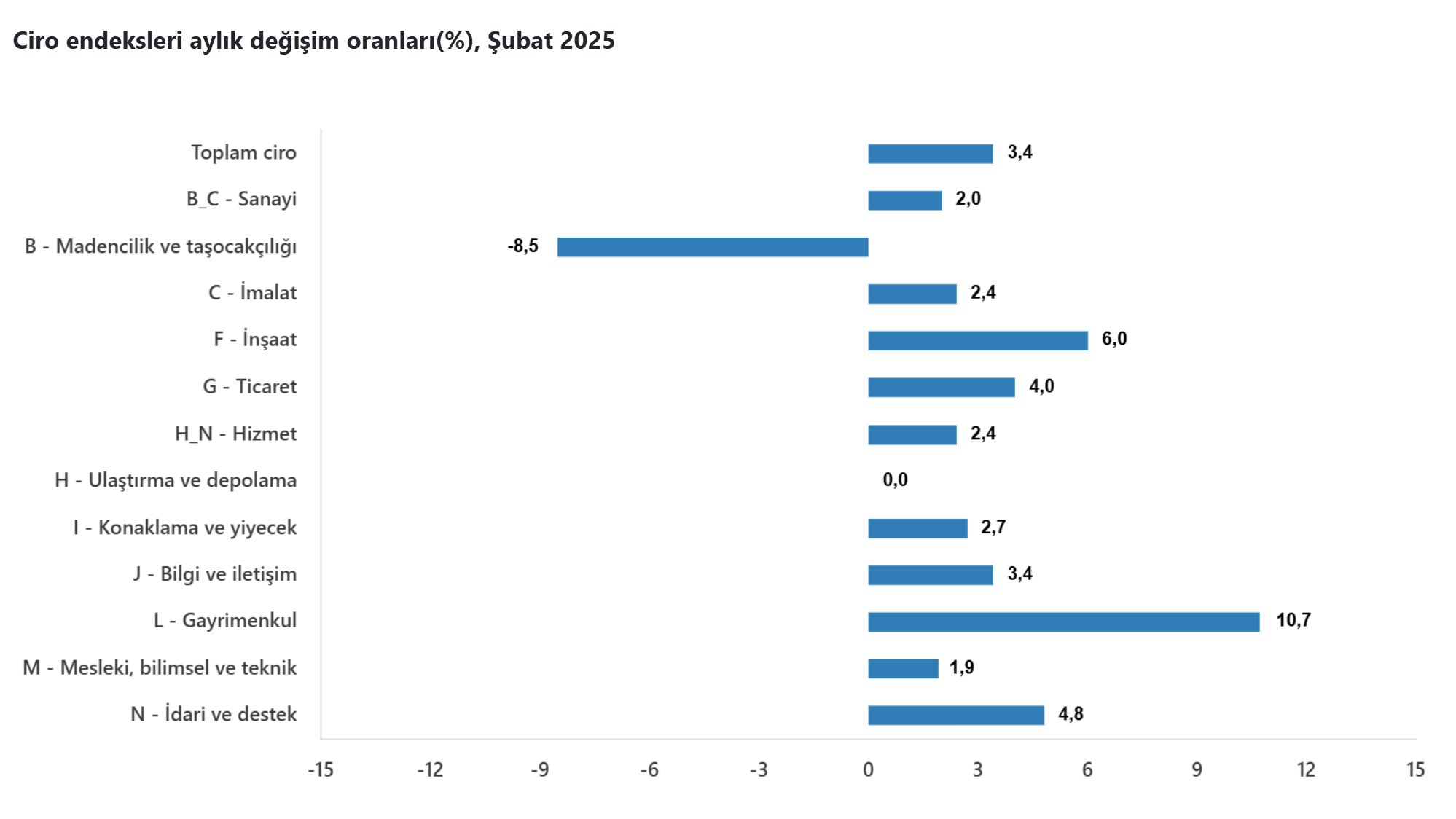 TÜİK verilerine göre sanayi, inşaat, ticaret ve hizmet sektörleri toplam ciro endeksi, şubatta geçen yılın aynı ayına göre yüzde 32 yükseliş kaydetti. Türkiye İstatistik Kurumu (TÜİK), şubat ayına ilişkin ciro endekslerini açıkladı. Buna göre, mevsim ve takvim etkisinden arındırılmış toplam ciro endeksi, şubatta aylık bazda yüzde 3,4 arttı. Takvim etkisinden arındırılmış sanayi, inşaat, ticaret ve hizmet sektörleri toplam ciro endeksi, aynı ayda yıllık bazda yüzde 32 artış gösterdi. Sanayi ve inşaat endeksleri Sanayide takvim etkisinden arındırılmış ciro endeksi, şubatta yıllık bazda yüzde 21 yükseldi. Mevsim ve takvim etkisinden arındırılmış sanayi ciro endeksi ise söz konusu ayda bir önceki aya göre yüzde 2 arttı. İnşaat sektöründe takvim etkisinden arındırılmış ciro endeksi, aynı ayda yıllık bazda yüzde 49,1 mevsim ve takvim etkisinden arındırılmış inşaat ciro endeksi de bir önceki aya kıyasla yüzde 6 artış kaydetti. Ticaret ve hizmet endeksleri Takvim etkisinden arındırılmış ticaret ciro endeksi, şubatta geçen yılın aynı ayına göre yüzde 34,4, mevsim ve takvim etkilerinden arındırılmış ticaret ciro endeksi de bir önceki aya göre yüzde 4 artış gösterdi. Hizmet sektöründe takvim etkisinden arındırılmış ciro endeksi, şubatta geçen yılın aynı ayına kıyasla yüzde 39,6, mevsim ve takvim etkilerinden arındırılmış hizmet ciro endeksi de bir önceki aya göre yüzde 2,4 yükseldi. Kaynak: TÜİK