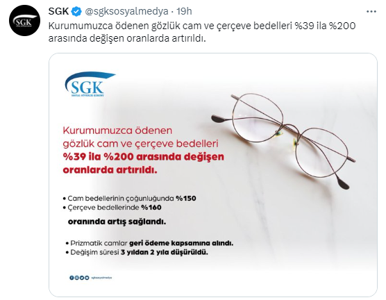 SGK, gözlük cam ve çerçeve destek bedellerinin yüzde 39 ila yüzde 200 arasında değişen oranlarda artırıldığını açıkladı. Sosyal Güvenlik Kurumu (SGK), sosyal medya hesabından yaptığı paylaşımda cam ve çerçeve destek bedellerinin artırıldığını açıkladı. Buna göre, cam bedellerinin çoğunda yüzde 150, çerçeve bedellerinde ise yüze 160 artış sağlandı. Değişim süresi 2 yıl oldu SGK'nin paylaşımında ayrıca prizmatik camların da geri ödeme kapsamına alındığı, değişim süresinin ise 3 yıldan 2 yıla indirildiği aktardı. Daha önceki uygulamada 3 yıldan önce değiştirilen gözlüklere destek sağlanmıyordu. Kaynak: SGK - Twitter Devlet katkılı gözlük nasıl alınır? Devlet katkılı gözlük alabilmek için; Sigortalı olunması, devlet yada özel hastaneden muayene olunması, göz rahatsızlığı varsa gözlük reçetesi yazılması ve doktorun yazdığı reçete ile SGK anlaşmalı gözlükçülere gidilmesi gerekmektedir. Bu adımları tamamlayan vatandaşlar gözlük camı ve çerçevesi için devletten katkı payı alabilir. Devlet gözlüğü kaç yılda bir karşılıyor? Gözlük camı ve çerçevesi değiştirilme süresi SGK'nin yeni duyurusuyla birlikte 2 yıl olarak belirlendi. Bu 2 yıl içerisinde keyfi olarak kesinlikle gözlük camı veya çerçevesi ise değiştirilemiyor. Ancak, 2 yıl süre dolmadan göz sağlığında ilerleme olduğu takdirde özellikle 0.5 diyoptrilik olması halinde 2 yıl sürenin dolmasını beklemeden istenilen zamanda doktorun rapor yazması şartıyla gözlük camı ve gözlük değişimi yapılabiliyor. Ayrıca göz hastalıkları uzmanı tarafından yazılan göz reçetelerinin de belirli süresi bulunuyor. Buna göre reçeteler en fazla 10 iş günü içerisinde işleme alınması gerekiyor. Aksi halde gözlük reçeteleri geçersiz sayılıyor. Devlet gözlük çerçevelerinde ne kadar destek sağlıyor? Sosyal Güvenlik Kurumu Sağlık Uygulama Tebliğinde Değişiklik Yapılmasına Dair Tebliğ’in 16/03/2023 tarihli ve 32134 (Mükerrer) Sayılı Resmi Gazete’de yayımlanmasıyla, Görmeye Yardımcı Tıbbi Malzemeler fiyat listesi de güncellendi. Buna göre, gözlük çerçeve fiyatı için sağlanan destek 37,80 TL'den 100 TL'ye çıkarıldı.