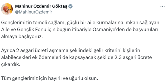 Bakan Göktaş, Aile ve Gençlik Fonu Projesi'nin kapsamının genişletildiğini belirterek Osmaniye’nin de projeye eklendiğini duyurdu. Aile ve Sosyal Hizmetler Bakanı Mahinur Özdemir Göktaş, Aile ve Gençlik Fonu projesinin kapsamının genişletildiğini duyurdu. Buna göre Göktaş, sosyal medya hesabından yaptığı paylaşımda, şu ifadeleri kullandı: "Gençlerimizin temeli sağlam, güçlü bir aile kurmalarına imkan sağlayan Aile ve Gençlik Fonu için bugün itibarıyla Osmaniye’den de başvuruları almaya başlıyoruz. Ayrıca 2 asgari ücreti aşmama şeklindeki gelir kriterini kişilerin alabilecekleri ek ödemeleri de kapsayacak şekilde 2.3 asgari ücrete çıkardık. Tüm gençlerimiz için hayırlı ve uğurlu olsun." Kaynak: Mahinur Özdemir Göktaş - X [news_id:744459]