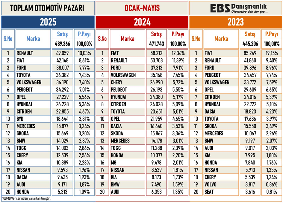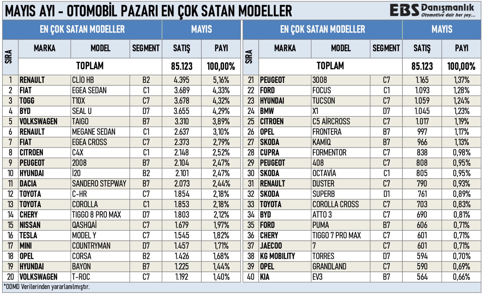 2025 yılına daralmayla başlayan otomobil pazarı mayıs ayında tarihin en yüksek ikinci satış rakamına ulaştı. Peki, bu dönemde en çok satan sıfır otomobiller neler oldu? İşte detaylar.. Türkiye’de otomotiv pazarı, 2025 yılının mayıs ayında güçlü bir performans sergiledi. Otomotiv Distribütörleri ve Mobilite Derneği (ODMD) verilerine göre otomobil ve hafif ticari araç toplam satışları mayıs ayında geçen yılın aynı ayına kıyasla yüzde 7,40 artışla 107 bin 730 adede ulaştı. Bu satış rakamı ise 2023 yılının ardından tüm zamanların en yüksek ikinci mayıs satışı olarak kayıtlara geçti. Mayıs ayında otomobil satışları bir önceki yılın aynı ayına göre %6,1 artarak 85.123 adet olurken, hafif ticari araç pazarı %12,8 artarak 22.607 adet oldu. [news_id:774254] Otomotiv gazetecisi Emre Özpeynirci’nin aktardığına göre aylık bazda en çok tercih edilen marka 10 bin 846 adetlik satışla Fiat oldu. Fiat’ı 9 bin 25 adetle Renault, 8 bin 379 adetle Volkswagen, 8 bin 175 adetle Ford ve 7 bin 64 adetle Peugeot takip etti. Yılın ilk beş ayına bakıldığında ise toplam satışlarda Renault liderliğini korudu. Ocak-Mayıs 2025 döneminde Renault, toplamda 49 bin 59 araç satarak beş aylık dönemin en çok tercih edilen marka oldu. Bunu sırasıyla 42 bin 148 satışla Fiat, 38 bin 7 satışla Ford, 36 bin 382 adetle Toyota ve 36 bin 190 adetle Volkswagen izledi. Kaynak: EBS Danışmanlık En çok satan otomobil modelleri Mayıs ayı satışlarına model bazlı bakıldığında ise listenin zirvesinde 4 bin 395 adetlik satışla Renault Clio yer aldı. Clio’yu 3 bin 689 adetlik satışla Fiat Egea Sedan takip etti. Yerli üretim Togg T10X ise 3 bin 678 adetlik satışla mayıs ayını üçüncü sırada tamamladı. Listenin dördüncü sırasında 3 bin 655 adet satışla BYD'nin elektrikli SUV modeli Seal U, beşinci sırasında ise 3 bin 310 adet satışla Volkswagen Taigo yer aldı. Kaynak: EBS Danışmanlık İlk beş ayın verileri incelendiğinde ise 20 bin 219 satışla Renault Clio’nun zirvede yer aldığı görüldü. Clio’yu sırasıyla 16 bin 917 satışla Fiat Egea, 15 bin 255 satışla Megane Sedan, 14 bin 779 satışla Toyota Corolla izledi. [news_id:772925]