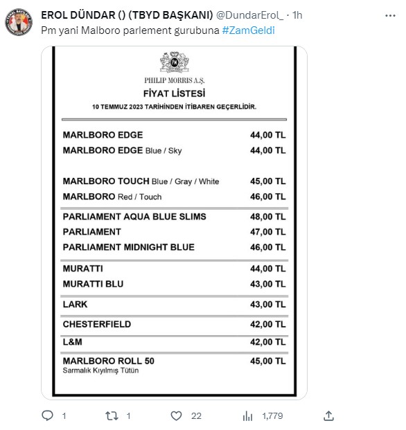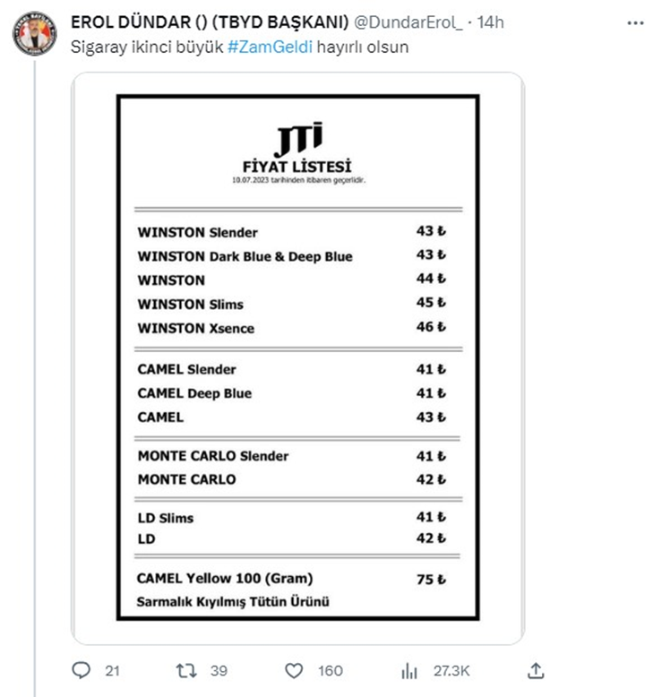 Tekel Bayiler Yardımlaşma Derneği (TBYD) Başkanı Erol Dündar, sosyal medya hesabından yaptığı paylaşım ile sigara ve alkollü içki fiyatlarına gelen zamları duyurdu. Alkollü içkiler ve sigaralara ÖTV zammı açıklanmasının ardından yeni fiyatlar etikletlerde görülmeye başlandı. Bugünden itibaren alkole KDV zammının da eklenmesiyle fiyatlarda güncellemeye gidildi. Buna göre JTI ve Philip Morris grubundaki sigaraların fiyatında 5 liralık artış gerçekleşti. TBYD Başkanı Erol Dündar ise zamlı fiyatları sosyal medya hesabından şu görsellerle duyurdu: Sigara fiyatlarına geçtiğimiz ay da 5 lira zam yapılmıştı. Tekel Bayiler Platformu Başkanı Özgür Aybaş, son zamlara ilişkin "Sigaraya 1 yılda son zamlarla birlikte toplam da 17 liralık zam geçişi oldu. Kaçak ve sahte sigaraya da aynı minvalde zam geçişi yapılıyor" yorumunda bulunmuştu. TBYD Başkanı Erol Dündar ayrıca alkol fiyatlarına ilişkin gelen zammı şu liste ile aktardı: Kaynak: Erol Dündar - Twitter