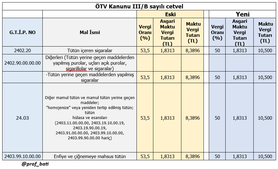Resmi Gazete'de yayımlanan kararla, sigara üzerinden alınan nispi vergi düşürülüp maktu vergi artırılarak enflasyon üzerindeki baskı azaltıldı. Sigaraların özel tüketim vergisi (ÖTV) oranı ile maktu vergi tutarında değişikliğe gidilirken ÖTV'nin kompozisyonunda düzenleme yapıldı. Konuya ilişkin Cumhurbaşkanı Kararı, Resmi Gazete'de yayımlanarak yürürlüğe girdi. Bu kapsamda, sigaraların ÖTV oranında indirim yapılırken bu indirimden kaynaklanacak vergi gelirlerindeki azalışı telafi etmek için maktu vergi tutarında artış gerçekleştirildi. Düzenleme ile sigaranın çarpan etkisi 4,4'ten 3,8'e indirilirken enflasyonla mücadeleye maliye politikası olarak destek verilmesinin hedeflendiği bildirildi. Böylece maliyetlerdeki 1 liralık artış nedeniyle sigara fiyatlarında yapılması gereken artış miktarı 4,4 lira değil 3,8 lira olacak. “Maliyet zamları daha düşük olacak” Ondokuz Mayıs Üniversitesi Hukuk Fakültesi Mali Hukuk Ana Bilim Dalı Prof. Dr. Murat Batı, sosyal medya hesabı X üzerinden yaptığı paylaşımla vergi oranlarındaki değişikliğin ne anlama geldiğini açıkladı. Buna göre Batı, konuyla ilgili paylaşımında şunları kaydetti: Resmi Gazete'de yer alan 9583 sayılı Cumhurbaşkanı Kararı ile sigaralar ile bazı tütün mamullerinde (nispi) ÖTV oranı %53,5'ten %50'ye düşürülürken bazı tütün ürünlerde maktu ÖTV tutarı ise 8,3896 liradan 10,500 liraya yükseltilmiştir. Aşağıda eski ve yeni durum gösterilmektedir. Buna göre piyasa satış fiyatı 87 lira olan bir paket sigarada KDV dahil vergi tutarı 69,4346 liradan 68,500 liraya yani yaklaşık 93 kuruş inmiş oldu. Kaynak: Murat Batı [news_id:765608]