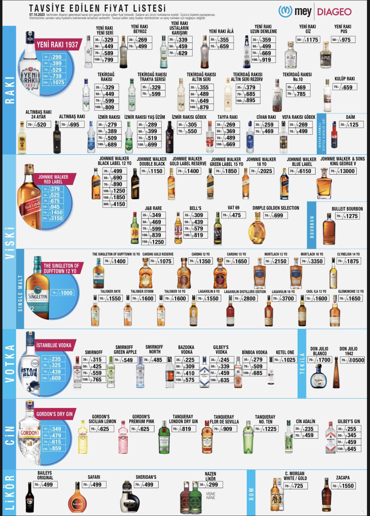 Sigaranın ardından Mey/Diageo grubu alkollü içki ürünlerine de zam yapıldı. Sigara zammının ardından bir zam da alkollü içkilere geldi. Zam haberini Tekel Bayileri Yardımlaşma Derneği (TBYD) Başkanı Erol Dündar sosyal medya hesabından duyurdu. Dündar paylaşımında "Mey gurubu yeni rakıya #ZamGeldi" ifadelerini kullandı. TBYD Başkanı Erol Dündar sosyal medya hesabından yaptığı paylaşımda ayrıca zamlı fiyat listesini de paylaştı. Dündar’ın paylaştığı listeye göre 7 Ekim tarihinden itibaren geçerli olacak zamlı fiyatlar ise şöyle listelendi: Kaynak: Erol Dündar - X