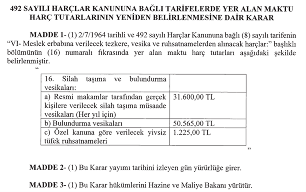 Resmi Gazete'de yayımlanan karar ile silah taşıma ve bulundurma ruhsatı harçlarına zam yapıldı. Resmi Gazete'de yayımlanan karara göre silah taşıma ve bulundurma vesikalarından alınacak maktu harç tutarlarında yaklaşık yüzde 100 artışa gidildi. 10362 sayılı Cumhurbaşkanı Kararı ile her yıl için resmi makamlar tarafından gerçek kişilere verilecek silah taşıma müsaade vesikaları için maktu harç tutarı 31 bin 600 lira olarak belirlendi. Daha önce taşıma ruhsatı için 5 yıllık dönemde 79 bin TL ödenirken yeni dönemde bu ücret 158 bin TL oldu. İlgili karara göre 5 yıllık bulundurma harç ücreti 25.282,70 TL'den 50.565 TL'ye, özel kanuna göre verilecek yivsiz tüfek ruhsatnamesi de 611,20 TL'den 1.225 TL'ye yükseldi. [news_id:783991]