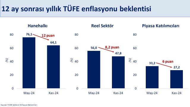 Hazine ve Maliye Bakanı Mehmet Şimşek, enflasyon beklentilerindeki iyileşmenin enflasyondaki katılıkların azalmasını desteklediğini belirtti. Hazine ve Maliye Bakanı Mehmet Şimşek, TCMB tarafından bugün açıklanan sektörel enflasyon beklentilerine ilişkin açıklama yaptı. Sosyal medya hesabından paylaşım yapan Şimşek, şunları kaydetti: "Dezenflasyon süreci tüm kesimlerde enflasyon beklentilerini olumlu etkiliyor. Enflasyonda zirveyi gördüğümüz mayıs ayına göre 12 ay sonrası beklenti hanehalkında 12 puan, reel sektörde 8,2 puan ve piyasa katılımcılarında 6 puan iyileşti. Beklentilerdeki bu iyileşme enflasyondaki katılıkların azalmasını destekliyor." Kaynak: Hazine ve Maliye Bakanlığı - X