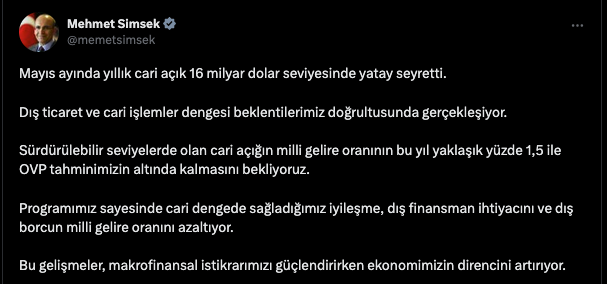 Hazine ve Maliye Bakanı Mehmet Şimşek, sürdürülebilir seviyelerdeki cari açığın milli gelire oranının bu yıl yaklaşık yüzde 1,5 ile OVP tahmininin altında kalmasını beklediklerini bildirerek, "Programımız sayesinde cari dengede sağladığımız iyileşme, dış finansman ihtiyacını ve dış borcun milli gelire oranını azaltıyor. Bu gelişmeler, makrofinansal istikrarımızı güçlendirirken ekonomimizin direncini artırıyor." ifadelerini kullandı. Şimşek, sosyal medya hesabından, Türkiye Cumhuriyet Merkez Bankası (TCMB) tarafından açıklanan mayıs ayı ödemeler dengesi verilerini değerlendirdi. Mayıs ayında, yıllık cari açığın 16 milyar dolar seviyesinde yatay seyrettiğini, dış ticaret ve cari işlemler dengesinin de beklentiler doğrultusunda gerçekleştiğini belirten Şimşek, şunları kaydetti: "Sürdürülebilir seviyelerde olan cari açığın milli gelire oranının, bu yıl yaklaşık yüzde 1,5 ile OVP tahminimizin altında kalmasını bekliyoruz. Programımız sayesinde cari dengede sağladığımız iyileşme, dış finansman ihtiyacını ve dış borcun milli gelire oranını azaltıyor. Bu gelişmeler, makrofinansal istikrarımızı güçlendirirken ekonomimizin direncini artırıyor."