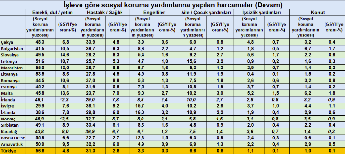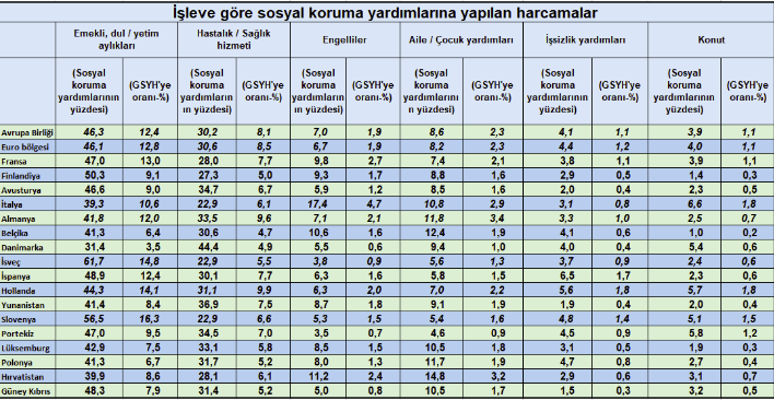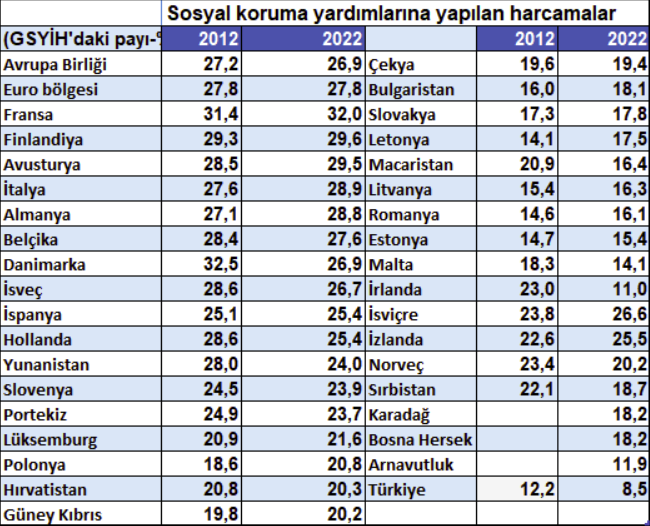 Türkiye'de sosyal koruma harcamaları, 2012 yılında gayrisafi yurtiçi hasılanın (GSYH) yüzde 12,2'sini oluştururken, bu oran 2022 yılı itibarıyla yüzde 8,5'e geriledi. Türkiye’ye en yakın sosyal koruma harcaması oranları ise İrlanda'da yüzde 11,0 ve Arnavutluk'ta yüzde 11,9 olarak kaydedildi. Avrupa Birliği İstatistik Ofisi EUROSTAT’ın verilerine göre, 2022 yılında AB ülkelerinde sosyal koruma yardımları için toplam harcama 4 trilyon 319 milyar avro olarak belirlendi. AB ülkelerinin toplam gayrisafi yurtiçi hasılasının (GSYH) yüzde 26,9'unu oluşturuyor. Sosyal koruma yardımlarının yüzde 46,3’ü emekli ve dul/yetim aylıklarına, yüzde 30’u sağlık harcamalarına, yüzde 8,6’sı aile/çocuk yardımlarına, yüzde 7,0’si engelli yardımlarına, yüzde 4,1’i işsizlik ödeneklerine ve yüzde 3,9’u konut yardımlarına yönlendirildi. AB ülkeleri arasında sosyal koruma harcamalarında önemli farklılıklar gözlemleniyor. Fransa, GSYH'sinin yüzde 32,0'sini sosyal korumaya harcayarak ilk sırada yer alıyor. Bunu Finlandiya (%29,6), Avusturya (%29,5), İtalya (%28,9) ve Almanya (%28,8) takip ediyor. Sosyal koruma harcamasının en düşük olduğu ülke ise yüzde 11,0 ile İrlanda. İrlanda'nın ardından Malta (%14,1), Estonya (%15,4) ve Romanya (%16,1) geliyor. Litvanya, Macaristan, Letonya, Slovakya, Bulgaristan ve Çekya, yüzde 20’nin altında sosyal yardım harcaması yapan ülkeler arasında yer alıyor. 2012-2022 yılları arasında Avrupa Birliği’nde sosyal koruma harcamalarının GSYH içindeki payı yüzde 27,2’den 26,9’a geriledi. Bu süre zarfında çoğu AB ülkesinde harcamalar artsa da, İrlanda’daki düşüş bu ortalamayı etkiledi. Türkiye’de ise GSYH’nın yüzde 12,2’si olan sosyal koruma harcamaları, 2022 yılında yüzde 8,5’e düştü. Türkiye’ye en yakın oran yüzde 11,0 ile İrlanda'ya aittir; ardından ise yüzde 11,9 ile Arnavutluk geliyor. Türkiye’nin komşularından Yunanistan yüzde 24,0, Bulgaristan yüzde 18,1 ve Romanya yüzde 16,1 oranında sosyal koruma harcaması yaptı. Türkiye’de emekli aylıklarına yapılan harcama, GSYH’nın yüzde 4,8’ini oluşturuyor. AB’de sosyal koruma harcamalarının yüzde 46,3’ü emekli ve dul/yetim aylıklarına giderken, bu oran AB genelinde GSYH’ye göre yüzde 12,4 olarak kaydedildi. Türkiye’de emekli aylıkları, toplam sosyal koruma harcamalarının yüzde 56,6’sını kapsıyor. Danimarka, yüzde 3,5 ile Türkiye’den daha düşük bir oranla emekli, dul ve yetim aylığı harcaması yapıyor. Danimarka’nın bu harcamaları toplam sosyal koruma yardımlarının yüzde 31,4’ünü oluştururken, sağlık hizmetlerine yapılan harcama yüzde 44,4’e ulaşıyor ve GSYH’ye oranı yüzde 4,9 olarak kaydediliyor. Türkiye’ye en yakın ülkeler arasında emekli aylığı harcamalarının GSYH’ye oranı yüzde 6,4 ile Belçika, yüzde 6,6 ile Bosna Hersek ve yüzde 6,7 ile Polonya yer alıyor. Habertürk'ten Ahmet Kıvanç'ın haberine göre, Türkiye’de emekli aylıklarından sonra en büyük sosyal koruma harcaması sağlık hizmetlerine ayrılıyor (%31,3), ardından aile/çocuk yardımları (%6,6) ve engelli yardımları (%2,6) geliyor. İşsizlik ödenekleri ve konut yardımları ise toplamın sadece yüzde 1’ini oluşturuyor. kaynak:habertürk - Ahmet Kıvanç