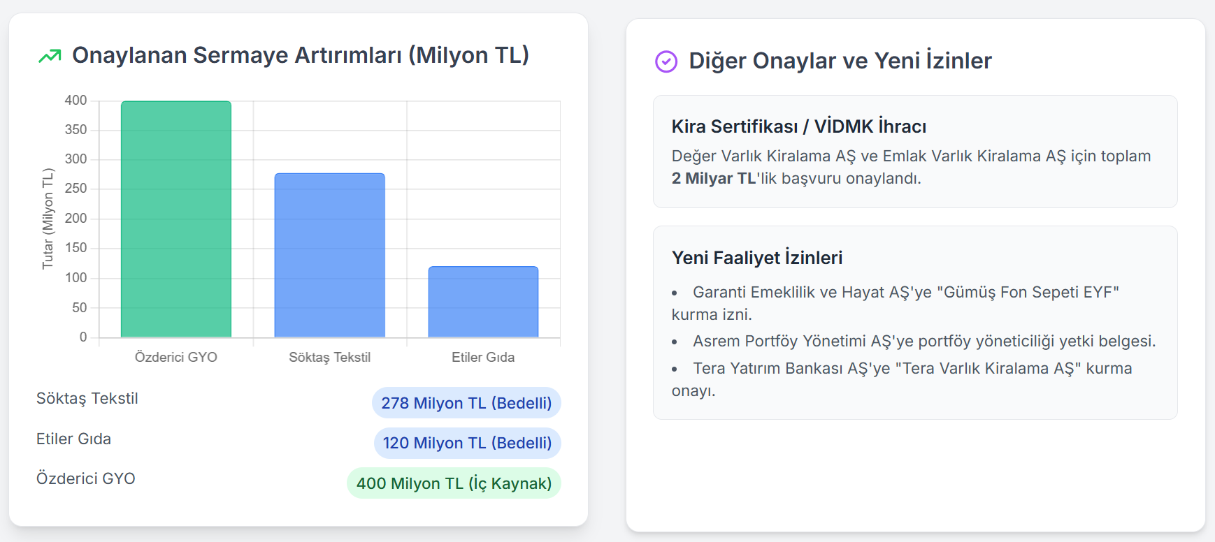 Sermaye Piyasası Kurulu, yurt dışında izinsiz kaldıraçlı işlem yaptırdığı belirlenen 16 internet sitesine erişim engeli getirdi. SPK haftalık bültenine göre Söktaş Tekstil Sanayi ve Ticaret AŞ’nin 278 milyon liralık, Etiler Gıda ve Ticari Yatırımlar Sanayi ve Ticaret AŞ’nin 120 milyon liralık bedelli sermaye artırımı ile Özderici Gayrimenkul Yatırım Ortaklığı AŞ’nin iç kaynaklardan 400 milyon liralık sermaye artırımı talepleri onaylandı. Kurul, Eker Süt Ürünleri Gıda Sanayi ve Ticaret AŞ'nin 2 milyar liralık, Garanti Filo Yönetim Hizmetleri AŞ'nin 15 milyar liralık, Loras Holding AŞ'nin 1 milyar 500 milyon liralık, D Yatırım Bankası AŞ'nin 2 milyar 500 milyon liralık ve İş Yatırım Menkul Değerler AŞ'nin 60 milyar liralık borçlanma aracı ihraç başvurusuna izin verdi. Değer Varlık Kiralama AŞ’nin 1 milyar liralık ve Emlak Varlık Kiralama AŞ’nin 1 milyar liralık kira sertifikası ve varlığa dayalı menkul kıymet ihraç başvuruları da uygun bulundu. Yeni faaliyet izinleri Kurul, Garanti Emeklilik ve Hayat AŞ’nin Garanti Emeklilik ve Hayat AŞ "Gümüş Fon Sepeti Emeklilik Yatırım Fonu" kurma talebini olumlu karşıladı. SPK, Asrem Gayrimenkul ve Girişim Sermayesi Portföy Yönetimi AŞ’nin münhasıran gayrimenkul ve girişim sermayesi yatırım fonları kurmak ve yönetmek ile sınırlı olmak üzere faaliyet izni ve portföy yöneticiliği yetki belgesi verilmesi talebini uygun bulurken, Tera Yatırım Bankası AŞ’nin, “Tera Varlık Kiralama Anonim Şirketi” ünvanlı bir varlık kiralama şirketinin kurulmasını teminen hazırlanan esas sözleşme metnine uygun görüş verilmesi talebini de olumlu karşıladı. Erişim engeli getirilen siteler Sermaye Piyasası Kurulu, Metro Ticari ve Mali Yatırımlar Holding AŞ hakkında yapılan inceleme sonucunda, şirkete 872 bin 282 lira idari para cezası uyguladı. Türkiye'de yerleşik kişilere yönelik internet aracılığıyla yurt dışında kaldıraçlı işlem yaptırıldığı belirlenen 16 internet sitesine erişimin engellenmesi için Sermaye Piyasası Kanunu'nun 99/A maddesinin üçüncü fıkrası ile 99. maddesinin dördüncü fıkrası uyarınca hukuki işlemlerin yapılması kararı alındı. RotaBorsa'nın aktardığına göre Sermaye Piyasası Kurulu’nun (SPK) son bülteninde erişim engeli talebinde bulunulan internet sitelerine ilişkin "Türkiye’de yerleşik kişilere yönelik olarak internet aracılığıyla izinsiz kripto varlık hizmet sağlayıcılığı faaliyetinde bulunduğu tespit edilen internet siteleri ve yurt dışında kaldıraçlı işlem yaptırdığı belirlenen internet sitelerinin adresleri aşağıda verilmiş olup, anılan internet sitelerine erişimin engellenmesi için Sermaye Piyasası Kanunu’nun 99/A maddesinin üçüncü fıkrası ile 99’uncu maddesinin dördüncü fıkrası uyarınca gerekli hukuki işlemlerin yapılmasına karar verildi." ifadeleri kullanıldı.