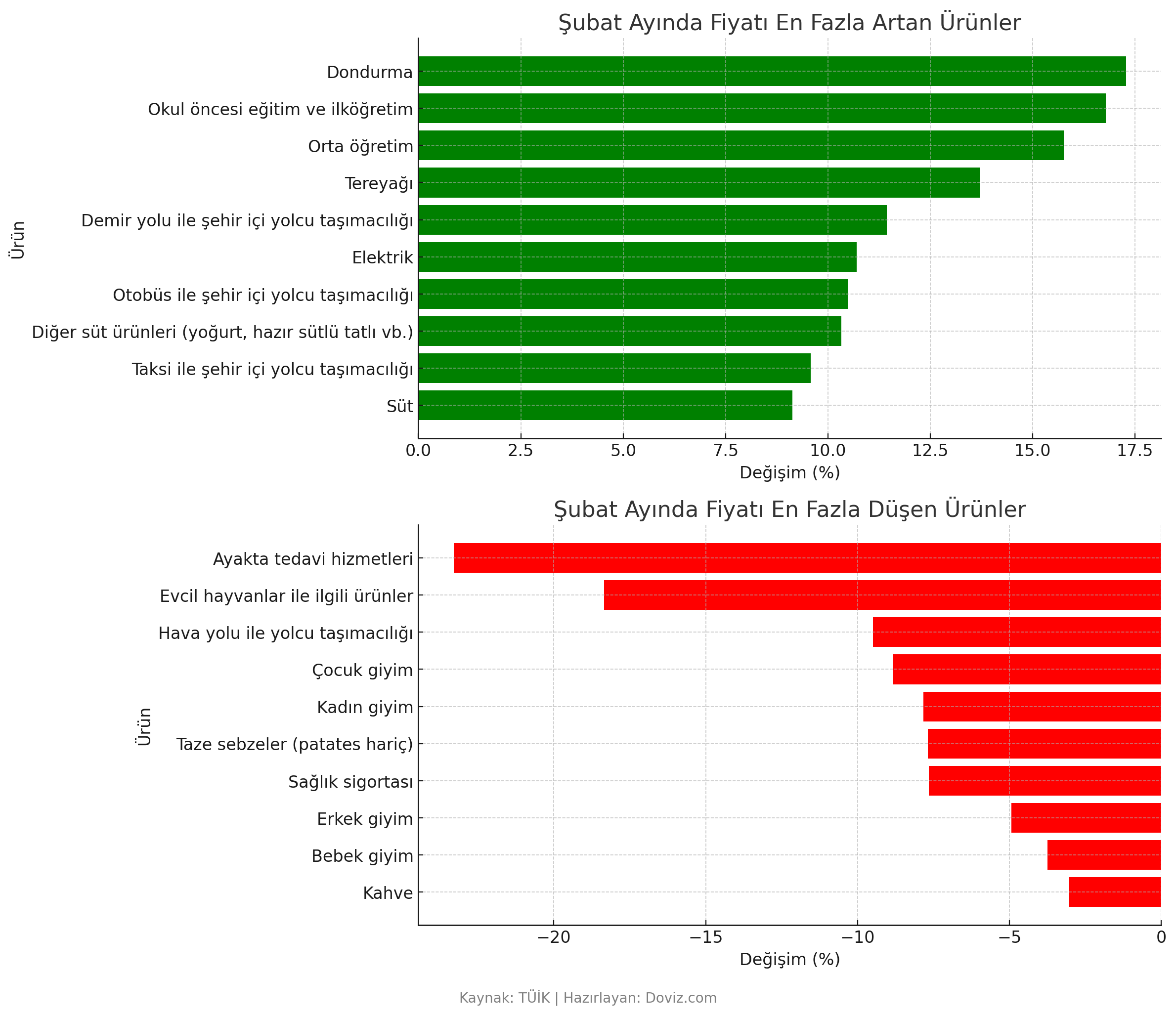 Tüketici fiyatları bazında şubatta en yüksek fiyat artışı yüzde 17,28 ile dondurmada gerçekleşirken, en çok ucuzlayan ürün yüzde 23,29 ile ayakta tedavi hizmetleri oldu. Türkiye İstatistik Kurumu (TÜİK) verilerine göre tüketici fiyatları bazında şubat ayında en yüksek fiyat artışı yüzde 17,28 ile dondurmada yaşandı. Dondurmadaki fiyat artışını yüzde 16,79 ile okul öncesi eğitim ve ilköğretim, yüzde 15,76 ile orta öğretim izledi. Şubat ayında fiyatı en çok artan diğer ürünler arasında yüzde 13,72 ile tereyağı, yüzde 11,44 ile demiryolu ile şehir içi yolcu taşımacılığı ve yüzde 10,7 ile elektrik yer aldı. Gıda ve eğitim kategorisindeki zam oranları dikkat çekerken, ulaştırma hizmetlerinde de artış gözlemlendi. En fazla düşüş ayakta tedavide Tüketici fiyatlarında en büyük düşüş ise yüzde 23,29 ile ayakta tedavi hizmetlerinde görüldü. Bu gerilemeyi yüzde 18,35 ile evcil hayvanlar ile ilgili ürünler, yüzde 9,49 ile havayolu ile yolcu taşımacılığı, yüzde 8,82 ile çocuk giyim, yüzde 7,84 ile kadın giyim ve yüzde 7,69 ile taze sebzeler takip etti. Şubat ayı fiyat değişimlerinde özellikle sağlık hizmetleri ve bazı temel tüketim ürünlerinde düşüş yaşanırken, gıda ve eğitim sektörlerinde belirgin fiyat artışları gözlemlendi. TÜİK'in tüketici fiyatları endeksine göre, şubatta aylık bazda fiyatları en fazla artan ürünlerle bunların bir önceki aya göre değişim oranları şöyle: Kaynak: TÜİK [news_id:763606] [news_id:764389] [news_id:764392]