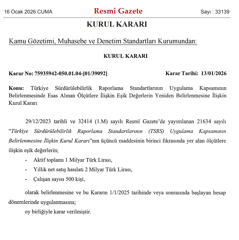 Kamu Gözetimi, Muhasebe ve Denetim Standartları Kurumu, sürdürülebilirlik raporlaması yapacak işletmeler için geçerli olan finansal sınırları ve personel sayılarını kapsayan kriterleri güncelledi. Kurum bünyesinde hazırlanan Türkiye Sürdürülebilirlik Raporlama Standartları'nın uygulama alanını tayin eden ölçütlere dair eşik değerlerin yeniden yapılandırılmasına yönelik Kurul Kararı, Resmi Gazete içerisinde yayımlanarak yürürlüğe girdi. Yapılan bu yeni düzenlemeyle hangi ölçekteki kurumların çevre ve toplum odaklı raporlama yapması gerektiğinin şartları belirlendi. Sürdürülebilirlik raporlamasında yeni eşik değerler belirlendi Yeni düzenleme doğrultusunda, birbirini takip eden iki raporlama döneminde aktif toplamı 1 milyar lira, yıllık net satış hasılatı 2 milyar lira ve çalışan mevcudu 500 kişi kriterlerinden en az ikisini sağlayan kurum, kuruluş ve işletmeler kapsama dahil edildi. Belirlenen bu sınırları aşan yapılar, sürdürülebilirlik raporlarını oluştururken Türkiye Sürdürülebilirlik Raporlama Standartları hükümlerine uymakla yükümlü olacak. Söz konusu karar, 1 Ocak 2025 tarihinde veya bu tarihten sonra başlayacak olan hesap dönemleri itibarıyla uygulanmaya başlayacak. Kaynak: Resmi Gazete