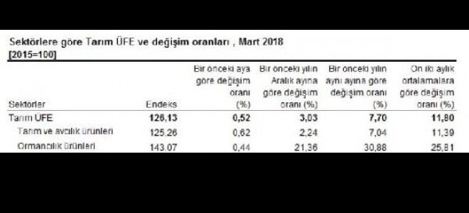 Hilal Sarı / İstanbul, 16 Nisan (DHA) – Tarım ürünleri üretici fiyatları Mart’ta bir önceki aya göre yüzde 0.52 artarken, yıllık bazda artış yüzde 7.7 oldu. Türkiye İstatistik Kurumu (TÜİK) tarafından yapılan açıklamaya göre tarım ürünleri üretici fiyat endeksi (Tarım–ÜFE), 2018 yılı Mart ayında bir önceki aya göre yüzde 0.52 arttı. Tarım-ÜFE bir önceki yılın Aralık ayına göre yüzde 3.03, bir önceki yılın aynı ayına göre yüzde 7.70 ve on iki aylık ortalamalara göre yüzde 11.80 arttı. Tarım ve avcılık ürünlerinde üretici fiyatları bir önceki aya göre yüzde 0.62, ormancılık ürünlerinde yüzde 0.44 artarken, balıkçılıkta yüzde 2.68 azaldı. Aylık en fazla artış canlı hayvan ve hayvansal ürün ana grubunda gerçekleşti Ana gruplarda bir önceki aya göre değişim; canlı hayvanlar ve hayvansal ürünlerde yüzde 2.64 artış, çok yıllık bitkisel ürünlerde yüzde 0.73 ve tek yıllık bitkisel ürünlerde ise yüzde 0.28 azalış olarak gerçekleşti. Alt tarım gruplarından sebzeler tarım-ÜFE aylık yüzde 0.61 azaldı. Alt tarım gruplarında; yağlı meyveler yüzde 4.46, canlı kümes hayvanları ve yumurtalar yüzde 3.42 ve canlı sığırlar, bunlardan elde edilen işlenmemiş süt yüzde 2.78 artarken, diğer ağaç ve çalı meyveleri ile sert kabuklu meyveler yüzde 4.54 ve çeltik yüzde 0.60 azalış gösterdi. Mart 2018’de endekste kapsanan 81 maddeden; 44 maddenin fiyatlarında artış, 32 maddenin fiyatlarında düşüş gerçekleşirken, 5 maddenin fiyatlarında değişim olmadı.