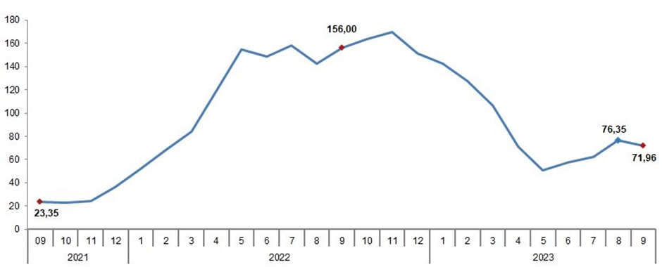 Tarım ürünleri üretici fiyat endeksi (Tarım-ÜFE), eylülde yıllık yüzde 71,96 artış kaydetti. Böylelikle tarım ürünlerindeki enflasyon baz etkisiyle eylülde gerileme kaydetmiş oldu. Türkiye İstatistik Kurumu (TÜİK) 2023 Eylül’e ilişkin Tarım Ürünleri Üretici Fiyat Endeksini açıkladı. Buna göre, Tarım-ÜFE’de (2015=100), 2023 yılı Eylül ayında bir önceki yılın aynı ayına göre yüzde 71,96 artış gerçekleştirdi. Kaynak: TÜK Sektörlerde bir önceki aya göre, balık ve diğer balıkçılık ürünlerinde yüzde 1,23 azalış, tarım ve avcılık ürünleri ve ilgili hizmetlerde yüzde 4,50 artış, ormancılık ürünleri ve ilgili hizmetlerde yüzde 8,54 artış gerçekleşti. Ana gruplarda bir önceki aya göre tek yıllık bitkisel ürünlerde yüzde 3,28 artış, çok yıllık bitkisel ürünlerde yüzde 4,74 artış ve canlı hayvanlar ve hayvansal ürünlerde yüzde 6,10 artış gerçekleşti. En yüksek artış meyvelerde Yıllık artışın düşük olduğu alt gruplar sırasıyla, yüzde 26,19 ile tahıllar (pirinç hariç), baklagiller ve yağlı tohumlar ve yüzde 50,65 ile çeltik oldu. Buna karşılık, yıllık artışın yüksek olduğu alt gruplar ise sırasıyla, yüzde 154,83 ile üzüm ve yüzde 146,92 ile yumuşak çekirdekli meyveler ve sert çekirdekli meyveler oldu. Bir önceki yılın aynı ayına göre azalış gösteren tek alt grup ise yüzde 5,93 ile lifli bitkiler oldu. Bir önceki aya göre artışın düşük olduğu alt gruplar yüzde 1,80 ile tahıllar (pirinç hariç), baklagiller ve yağlı tohumlar ve yüzde 2,86 ile koyun ve keçi, canlı; bunların işlenmemiş süt ve yapağıları oldu. Aylık artışın yüksek olduğu alt gruplar ise, yüzde 31,62 ile yağlı meyveler ve yüzde 24,05 ile diğer ağaç ve çalı meyveleri ile sert kabuklu meyveler oldu. Eylül 2023’te, endekste kapsanan 84 maddeden, 22 maddenin ortalama fiyatında azalış, 57 maddenin ortalama fiyatında ise artış gerçekleşti.