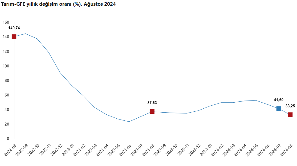 Tarımsal girdi fiyat endeksi (Tarım-GFE) ağustosta yıllık yüzde 33,25 arttı, aylık yüzde 1,39 arttı. TÜİK Ağustos 2024 dönemine ait Tarımsal Girdi Fiyat Endeksi'ni açıkladı. Tarım-GFE'de (2020=100), 2024 yılı Ağustos ayında bir önceki aya göre yüzde 1,39 artış, bir önceki yılın Aralık ayına göre yüzde 22,33 artış, bir önceki yılın aynı ayına göre yüzde 33,25 artış ve on iki aylık ortalamalara göre yüzde 43,15 artış gerçekleşti. Kaynak: TÜİK Ana gruplarda bir önceki aya göre, tarımda kullanılan mal ve hizmetler endeksinde yüzde 0,99 artış, tarımsal yatırıma katkı sağlayan mal ve hizmetler endeksinde yüzde 3,75 artış gerçekleşti. Bir önceki yılın aynı ayına göre tarımda kullanılan mal ve hizmetler endeksinde yüzde 30,90 artış, tarımsal yatırıma katkı sağlayan mal ve hizmetler endeksinde yüzde 48,51 artış gerçekleşti. Yıllık değişimin en yüksek olduğu alt grup yüzde 74,09 artış ile veteriner harcamaları, aylık değişimin en yüksek olduğu alt grup yüzde 4,62 artış ile tohum ve dikim materyali oldu.