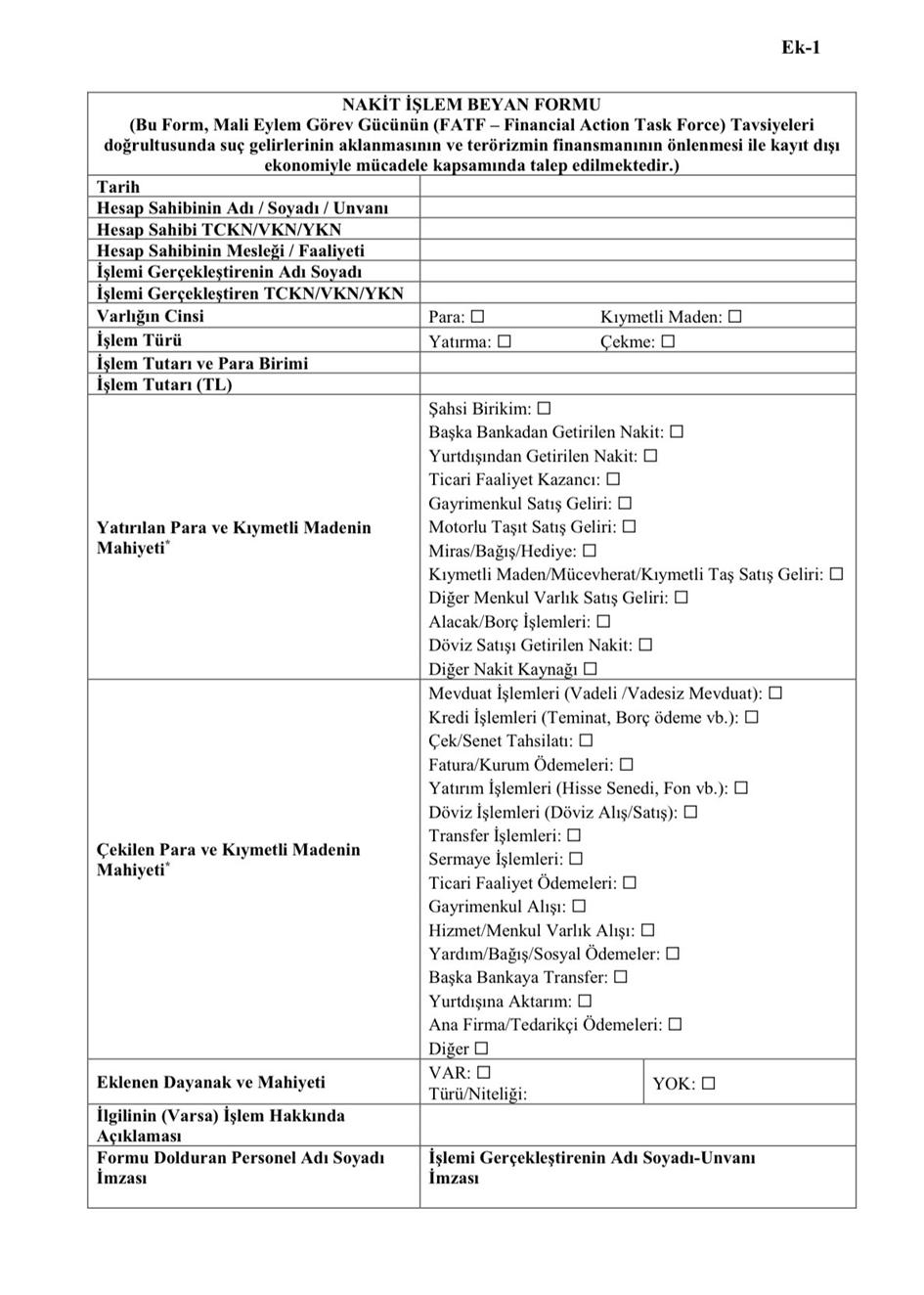 Hazine ve Maliye Bakanlığı, kayıt dışı ekonomi ve terör finansmanını engellemek amacıyla para transferlerinde yeni yükümlülükleri devreye almayı hedeflediği taslak tebliği görüşe açtı. 1 Ocak 2026'da yürürlüğe girmesi hedeflenen taslak tebliğde, 2 milyon TL üzerindeki nakit işlemlerde Nakit İşlem Beyan Formu doldurulması istendi. Hazine ve Maliye Bakanlığı’na bağlı Mali Suçları Araştırma Kurulu (MASAK), finansal kuruluşlar aracılığıyla gerçekleştirilen EFT, havale ve nakit işlemlerde şeffaflığı artırmak, kayıt dışılığı önlemek ve finansal sistemin güvenliğini güçlendirmek amacıyla MASAK Genel Tebliğ Taslağını hazırladı. MASAK tarafından yayımlanan tebliğde, özellikle yüksek tutarlı elektronik transfer, havale ve nakit işlemlerinin daha yakından izlenmesi ve izlenebilirliğin sağlanması amacıyla kademeli beyan yükümlülükleri getirilmesi planlandı. 20 karakterli açıklama zorunluluğu Hazine ve Maliye Bakanlığı'nın sitesinde paylaşılan taslak tebliğe göre 200 bin TL ile 2 milyon TL arasındaki nakit işlemlerde işlem mahiyeti seçilecek, müşterinin "diğer", "bireysel ödeme" ve benzeri seçenekleri tercih etmesi durumunda minimum 20 karakterli işlem açıklaması temin edilecek. 2 milyon TL üzerinde form doldurulacak 2 milyon TL ila 20 milyon TL arası nakit işlemlerde ise müşterinde Nakit İşlem Beyan Formu doldurması istenecek. 20 milyon TL üzerinde kaynağı sorulacak Yayımlanan taslağa göre finansal kuruluşlar, işlem tutarı ya da birbiriyle bağlantılı birden fazla işlemin toplam tutarı 20 milyon TL’yi aşan nakit işlemlerde Nakit İşlem Beyan Formunun, detaylı bir açıklama içerecek şekilde ve ilgili dayanakları eklenmek suretiyle doldurulmasını sağlamakla yükümlü olacak. Yani söz konusu formun doldurulmasının yanında fonun kaynağına dair de açıklama yapılması zorunlu olacak. 1 Ocak 2026'da yürürlüğe girmesi hedefleniyor Görüşe açılan tebliğin 1 Ocak 2026'da yürürlüğe girmesi hedefleniyor. MASAK açıklamasına göre söz konusu taslağın geliştirilmesi ve yayımlanmaya hazır hale getirilmesi için çalışmalar devam ederken, mevcut taslakta yer alan konuların geliştirilmesi, değiştirilmesi veya katkıda bulunulması ile ilgili görüş ve öneriler 18 Ağustos 2025 tarihine kadar “gorus@masak.gov.tr” adresine iletilebilecek.