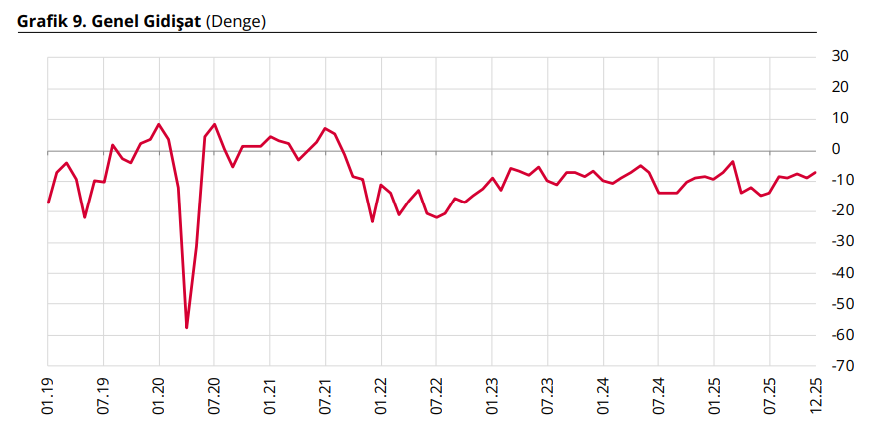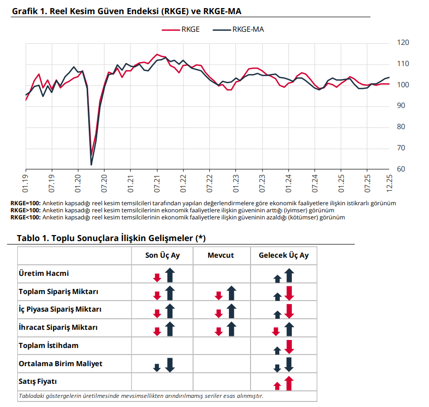 Türkiye Cumhuriyet Merkez Bankası (TCMB) verilerine göre 2025 yılı Aralık ayında Reel Kesim Güven Endeksi (RKGE-MA), bir önceki aya göre 0,5 puan arttı. Türkiye Cumhuriyet Merkez Bankası (TCMB), kasım ayına ilişkin İktisadi Yönelim İstatistikleri ve Reel Kesim Güven Endeksi'ni açıkladı. İktisadi Yönelim Anketi sonuçları, imalat sanayinde faaliyet gösteren 1799 iş yerinin yanıtlarının ağırlıklandırılıp toplulaştırılmasıyla elde edildi. 2025 yılı Aralık ayında mevsimsellikten arındırılmış Reel Kesim Güven Endeksi (RKGE-MA), bir önceki aya göre 0,5 puan artarak 103,7 seviyesinde gerçekleşti. Endeksi oluşturan anket sorularına ait yayılma endeksleri incelendiğinde, gelecek üç aydaki üretim hacmi, mevcut mamul mal stoku, genel gidişat ve gelecek üç aydaki toplam istihdama ilişkin değerlendirmeler endeksi artış yönünde etkilerken, mevcut toplam sipariş miktarı, gelecek üç aydaki ihracat sipariş miktarı, sabit sermaye yatırım harcaması ve son üç aydaki toplam sipariş miktarına ilişkin değerlendirmeler endeksi azalış yönünde etkiledi. Mevsimsellikten arındırılmamış Reel Kesim Güven Endeksi (RKGE) ise bir önceki aya göre değişmeyerek 100,8 seviyesinde gerçekleşti. Son 3 aya yönelik değerlendirmeler Son üç aya yönelik değerlendirmelerde, üretim hacminde artışbildirenler lehine olan seyrin bir önceki aya göre zayıfladığı, ihracat sipariş miktarında ve iç piyasa sipariş miktarında artışbildirenler lehine olan seyrin ise azalış bildirenler lehine döndüğü görüldü. Mevcut toplam siparişlerin mevsim normallerinin altında olduğu yönündeki değerlendirmelerin bir önceki aya göre güçlendiği, mevcut mamul mal stokları seviyesinin mevsim normallerinin üstünde olduğunu bildirenler lehine olan seyrin ise zayıfladığı gözlendi. Gelecek 3 aya ilişkin beklentiler Gelecek üç aya yönelik değerlendirmelerde, üretim hacmi ve iç piyasa sipariş miktarında artış bekleyenler lehine olan seyrin bir önceki aya göre güçlendiği, ihracat sipariş miktarında artış bekleyenler lehine olan seyrin ise zayıfladığı görüldü. Gelecek üç aydaki istihdama ilişkin azalış yönlü beklentilerin artış bekleyenler lehine döndüğü, gelecek on iki aydaki sabit sermaye yatırım harcamasına ilişkin artış yönlü beklentilerin ise bir önceki aya göre zayıfladığı gözlendi. Ortalama birim maliyetlerde, gelecek üç ayda artış olacağını bekleyenler ile son üç ayda artış olduğunu bildirenler lehine olan seyrin zayıfladığı görüldü. Gelecek üç aydaki satış fiyatına ilişkin artış yönlü beklentilerin ise güçlendiği gözlendi. Gelecek on iki aylık dönem sonu itibarıyla yıllık ÜFE beklentisi bir önceki aya göre 0,5 puan azalarak yüzde 33,0 seviyesinde gerçekleşti. İçinde bulunduğu sanayi dalındaki genel gidişat konusunda, bir önceki aya kıyasla daha kötümser olduğunu belirtenler lehine olan seyrin zayıfladığı görüldü. Kaynak: TCMB