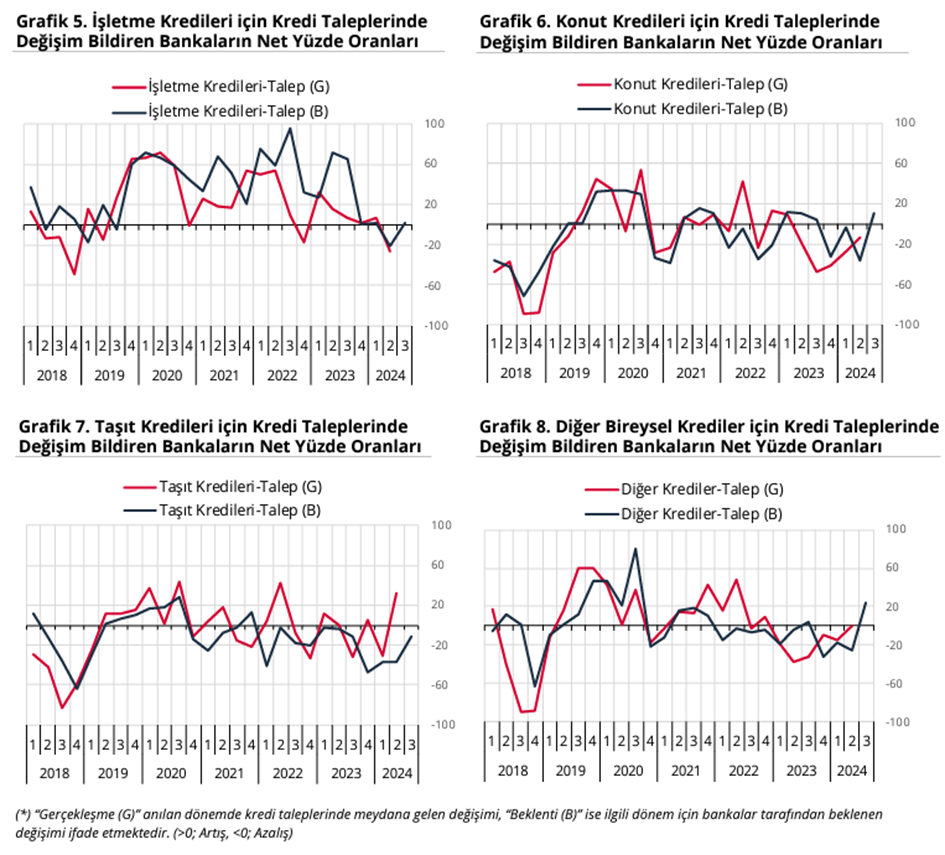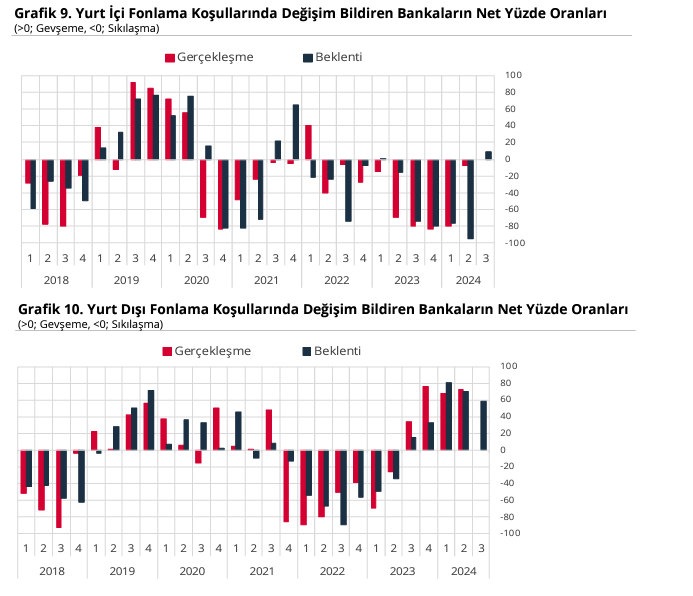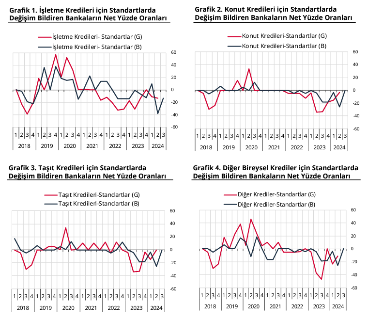 Türkiye Cumhuriyet Merkez Bankası (TCMB) tarafından yayımlanan 2024 yılı ikinci çeyrek Banka Kredileri Eğilim Anketi sonuçları, bankaların kredi verme standartlarını sıkılaştırmaya devam ettiğini ve kredi taleplerinde bazı değişiklikler yaşandığını ortaya koydu. TCMB, bankaların 2024 yılının ikinci çeyreğine ilişkin değerlendirmeleri ile 2024 yılının üçüncü çeyreğine ilişkin beklentilerini içeren Banka Kredileri Eğilim Anketi sonuçlarını açıkladı. Anket sonuçlarına göre, 2024 yılının ikinci çeyreğinde bankalar, genel olarak işletmelere kullandırdıkları kredilere uyguladıkları standartları sıkılaştırmaya devam etti. Raporun alt kırılımları incelendiğinde ise tüm kredi türlerine uygulanan standartlarda sıkılaşma gözlendi. 2024 yılının üçüncü çeyreği için ise bankaların beklentisi, genel olarak işletmelere verilen kredilere uygulanan standartlardaki sıkılaşmanın devam edeceği yönünde oldu. Ankette ayrıca 2024 yılının ikinci çeyreğinde tüm bireysel kredi türlerine uygulanan standartlarda sıkılaşmanın zayıflayarak devam ettiği görüldü. 2024 yılının üçüncü çeyreği için bankaların beklentisi ise tüm bireysel kredi türlerine uygulanan standartlardaki sıkılaşma seyrinin sona ereceği yönünde oldu. Kaynak: TCMB Kredi talebindeki değişimler Anket sonuçları kredi talebi açısından incelendiğinde, genel olarak işletmelere verilen kredilere olan talepteki artış yönlü seyrin, 2024 yılının ikinci çeyreğinde yerini azalışa bıraktığı; alt kırılımlar incelendiğinde ise yabancı para cinsinden açılan krediler dışındaki tüm kredilere olan talebin azaldığı görüldü. 2024 yılının üçüncü çeyreğinde, genel olarak işletmelere verilen kredilere olan talepteki azalışın yerini tekrar zayıf bir artışa bırakması beklenirken, 2024 yılının ikinci çeyreğinde konut ve diğer bireysel kredi talebindeki azalışın zayıfladığı, taşıt kredi talebindeki azalışın ise yerini güçlü bir artışa bıraktığı aktarıldı. 2024 yılının üçüncü çeyreği için bankaların beklentisi ise konut ve diğer bireysel kredi talebindeki azalışın yerini artışa bırakacağı, taşıt kredi talebindeki artışın ise tekrar azalışa döneceği yönünde oldu. Kaynak: TCMB Bankaların fon sağlama imkânlarının gelişimi incelendiğinde, 2024 yılının ikinci çeyreğinde yurt içi fonlama koşullarındaki sıkılaşma yönlü seyrin zayıflayarak, yurt dışı fonlama koşullarındaki gevşeme yönlü seyrin ise güçlenerek devam ettiği görüldü. 2024 yılının üçüncü çeyreği için yurt içi fonlama koşullarındaki sıkılaşmanın yerini gevşemeye bırakacağı, yurt dışı fonlama koşullarındaki gevşemenin ise devam etmesinin beklendiği bildirildi. Kaynak: TCMB Özetle, 2024 yılı ikinci çeyrek Banka Kredileri Eğilim Anketi sonuçları, bankaların kredi verme standartlarında sıkılaşmanın devam ettiğini ve kredi taleplerinde belirgin değişiklikler yaşandığını ortaya koydu. Üçüncü çeyrek beklentileri ise kredi standartlarında ve taleplerinde bazı iyileşmeler olabileceğine işaret etti. [news_id:736715]