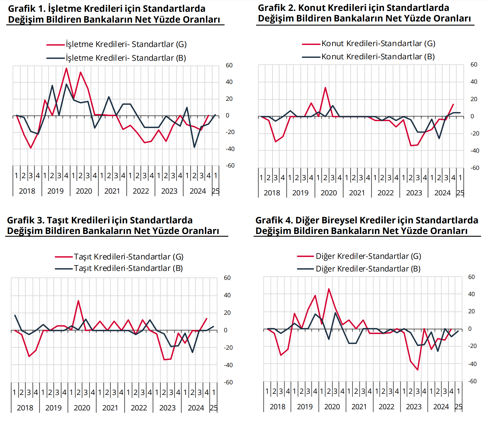 Türkiye Cumhuriyet Merkez Bankası (TCMB) Banka Kredileri Eğilim Anketi'nde bankaların işletmelere kullandırdıkları kredilere uyguladıkları standartlardaki sıkılaşmanın sona erdiği görülürken, bu yılın ilk çeyreği için bankaların beklentisi yurt içi ve yurt dışı fonlama koşullarındaki gevşemenin devam edeceği yönünde oldu. TCMB'nin bankaların 2024'ün dördüncü çeyreğine ilişkin değerlendirmeleri ile 2025 yılının ilk çeyreğine ilişkin beklentilerini içeren "Banka Kredileri Eğilim Anketi" yayımlandı. Ankete göre, bu yılın dördüncü çeyreğinde alt kırılımlar incelendiğinde, yabancı para cinsinden açılan kredilere uygulanan standartlardaki sıkılaşmanın yerini gevşemeye bıraktığı, diğer işletme kredilerine uygulanan standartlardaki sıkılaşmanın da son bulduğu gözlendi. 2025 yılının ilk çeyreği için bankaların beklentisi, genel olarak işletmelere verilen kredilere uygulanan standartlarda bir miktar gevşeme başlayacağı yönünde olurken, 2024 yılının dördüncü çeyreğinde konut ve taşıt kredilerine uygulanan standartlardaki sıkılaşmanın yerini gevşemeye bıraktığı, diğer bireysel kredi türlerine uygulanan standartlardaki sıkılaşmanın da sona erdiği görüldü. Bu yılın ilk çeyreği için bankaların beklentisi, konut ve taşıt kredilerine uygulanan standartlardaki gevşemenin devam edeceği, diğer bireysel kredi türlerine uygulanan standartlarda ise bir miktar sıkılaşma olacağı yönünde oldu. Kaynak: TCMB - Banka Eğilimleri Anketi Kredi talebi Anket sonuçları kredi talebi açısından incelendiğinde, genel olarak işletmelere verilen kredilere olan talepteki azalış yönlü seyir, 2024 yılının dördüncü çeyreğinde yerini artışa bıraktı. Alt kırılımlar incelendiğinde, tüm işletme kredi türlerine olan talepte artış gözlendi. Bu yılın ilk çeyreğinde, genel olarak işletmelere verilen kredilere olan talepteki artışın güçlenerek devam etmesinin beklendiği belirtildi. 2024 yılının dördüncü çeyreğinde, bir önceki çeyrekte görülen konut kredi talebindeki artış yerini tekrar azalışa, taşıt kredi talebindeki azalış ise yerini tekrar artışa bırakırken, diğer bireysel kredi talebinde görülen artışın zayıflayarak devam ettiği bildirildi. Bu yılın ilk çeyreği için bankaların beklentisi, tüm bireysel kredi türlerinde talepte artış görüleceği yönünde oldu. Fonlama Koşulları Bankaların fon sağlama imkanlarının gelişimi incelendiğinde, 2024 yılının dördüncü çeyreğinde yurt içi fonlama koşullarındaki sıkılaşma seyrinin yerini gevşemeye bıraktığı, yurt dışı fonlama koşullarındaki gevşeme yönlü seyrin devam ettiği görüldü. Bu yılın ilk çeyreği için, yurt içi ve yurt dışı fonlama koşullarındaki gevşemenin devam edeceği bekleniyor.