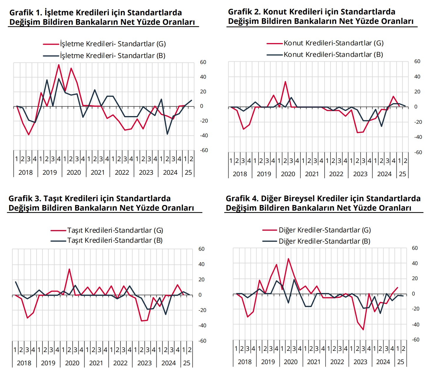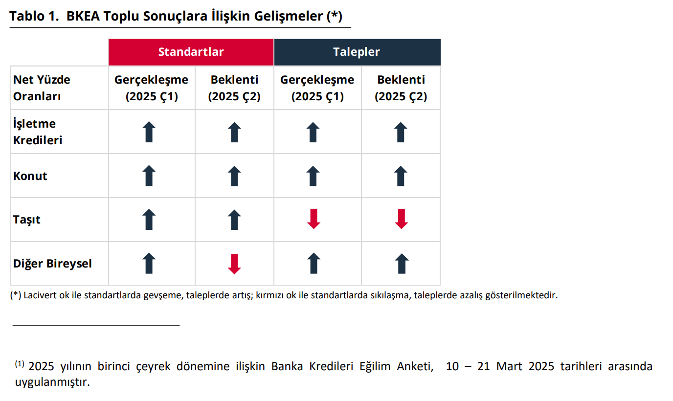 TCMB, 2025 yılının ikinci çeyreği için bankaların beklentisinin, konut ve diğer bireysel kredi türlerine olan talepteki artışın güçlenerek, taşıt kredi talebindeki azalışın ise zayıflayarak devam edeceği yönünde” olduğunu açıkladı. Türkiye Cumhuriyet Merkez Bankası (TCMB) 1. Çeyrek Banka Kredileri Eğilim Anketi'ni yayımladı. Raporda kredi beklentilerine ilişkin ise şunlar aktarıldı: “2025 yılının ilk çeyreğinde konut ve taşıt kredilerine uygulanan standartlarda gevşemenin zayıflayarak devam ettiği, diğer bireysel kredi türlerine uygulanan standartlarda ise gevşeme başladığı görülmektedir. Konut kredilerinde risk algılaması, taşıt kredilerinde rekabet baskısı, diğer bireysel kredi türlerinde ise rekabet baskısı ile talep edilen teminatlara ilişkin riskler standartları gevşetici yönde etkileyen en önemli faktörler olmuştur. 2025 yılının ikinci çeyreği için bankaların beklentisi, konut ve taşıt kredilerine uygulanan standartlardaki gevşemenin zayıf şekilde devam edeceği, diğer bireysel kredi türlerine uygulanan standartlarda ise bir miktar sıkılaşma başlayacağı yönündedir. Kaynak: TCMB Anket sonuçları kredi talebi açısından incelendiğinde, genel olarak işletmelere verilen kredilere olan talepteki artış, 2025 yılının ilk çeyreğinde bir miktar güçlenerek devam etmiştir. Alt kırılımlar incelendiğinde, tüm işletme kredi türlerine olan talepte artış gözlenmiştir. 2025 yılının ikinci çeyreğinde, genel olarak işletmelere verilen kredilere olan talepteki artışın güçlenerek devam etmesi beklenmektedir. 2025 yılının birinci çeyreğinde, bir önceki çeyrekte görülen konut kredi talebindeki azalış yerini tekrar artışa, taşıt kredi talebindeki artış ise yerini tekrar azalışa bırakmıştır. Diğer bireysel kredi talebinde görülen artış güçlenerek devam etmiştir. 2025 yılının ikinci çeyreği için bankaların beklentisi, konut ve diğer bireysel kredi türlerine olan talepteki artışın güçlenerek, taşıt kredi talebindeki azalışın ise zayıflayarak devam edeceği yönündedir. Kaynak: TCMB Bankaların fon sağlama imkânlarının gelişimi incelendiğinde, 2025 yılının ilk çeyreğinde yurt içi ve yurt dışı fonlama koşullarındaki gevşemenin devam ettiği görülmüştür. 2025 yılının ikinci çeyreği için de yurt içi ve yurt dışı fonlama koşullarındaki gevşemenin devam edeceği beklenmektedir."