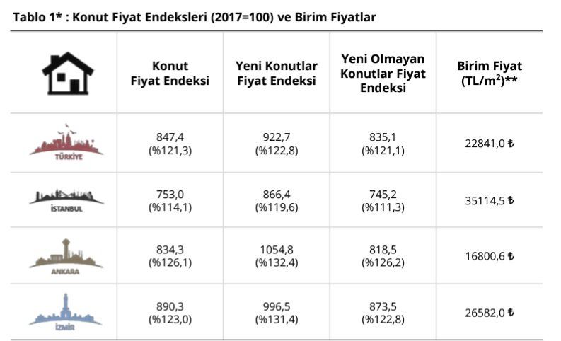 Türkiye Cumhuriyet Merkez Bankası (TCMB) konut fiyat endeksi verilerine göre nisanda konut fiyatları 1 yılın en yavaş artışını kaydetti. Merkez Bankası (TCMB) 2023 Nisan’a ilişkin Konut Fiyat Endeksini (KFE) açıkladı. Buna göre, 2023 Nisan’da bir önceki aya göre yüzde 4,7 oranında artan KFE, bir önceki yılın aynı ayına göre yüzde 121,3 yükseldi. Aylık bazdaki yüzde 4,7’lik yükseliş ise konut fiyatlarının son bir yıl içinde en düşük artışını kaydettiğine işaret etti. İller bazında incelendiğinde ise konut fiyatları, yıllık bazda nisan ayında İstanbul’da yüzde 114,1, İzmir’de yüzde 123 ve Ankara’da yüzde 126,1 yükseldi. Ülke genelindeki konut fiyatları ocakta yüzde 153,1, şubatta yüzde 141,5 ve martta ise yıllık bazda yüzde 132,8 artmıştı. Böylece konut fiyatlarının artış hızındaki yavaşlama nisan ayında da sürmüş oldu. Ancak İstanbul’da 100 metrekare bir evin bedeli nisan ayı itibarıyla 3,5 milyon TL’ye çıktı. Kaynak: TCMB En yüksek artış Zonguldak, Karabük ve Bartın’da Nisan ayında yıllık bazda en yüksek artış gösteren iller yüzde 147 ile Zonguldak, Bartın ve Karabük oldu. Bunu yüzde 143,2 ile Edirne, Kırklareli, Tekirdağ; yüzde 142,2 ile de Çankırı, Kastamonu, Sinop izledi. Ülke genelindeki ortalama metrekare fiyatı 22 bin 841 TL Türkiye'de bir konutun metrekare fiyatı nisan ayı itibarıyla 22 bin 841 TL’ye çıktı. Yani 100 metrekare bir evin ülke genelindeki ortalama maliyeti 2 milyon 284 bin 100 TL’ye ulaştı. Ankara’da metrekare fiyatları nisan ayı itibarıyla 16 bin 800 TL’ye çıkarken; İzmir’de 26 bin 582 TL’ye çıktı. İstanbul’da ise metrekare fiyatları nisan ayı itibarıyla 35 bin 114 TL’ye yükseldi. İstanbul’daki 100 metrekare bir evin bedeli nisan ayı itibarıyla 3,5 milyon TL’ye çıkmış oldu. [news_id:697655]