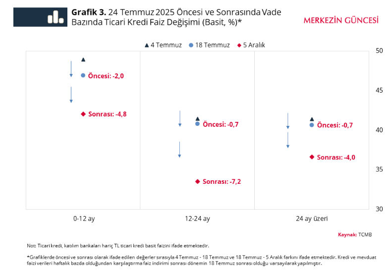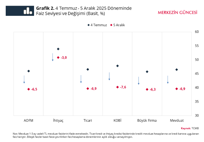 Türkiye Cumhuriyet Merkez Bankasının (TCMB) analizinde, Bankanın, bu yılın temmuz-ekim döneminde politika faizinde toplam 650 baz puan indirime gitmesinin 4 Temmuz-5 Aralık döneminde banka faizlerine belirgin şekilde yansıdığı belirtildi. TCMB Bankacılık ve Finansal Kuruluşlar Genel Müdürlüğünde görev yapan uzman Ahmet Deryol ve Mehmet Emre Şamcı ile uzman yardımcısı Efe Mert Ustaoğlu tarafından hazırlanan "TCMB Faiz İndirimlerinin Kredi ve Mevzuat Faizlerine Yansımaları" analizi, bankanın blog sayfası Merkezin Güncesi'nde yayımlandı. Analizde, TCMB politika faizinin, bankaların 1 hafta vadeli borçlanma faizi olduğu hatırlatılarak, politika faizinde yapılan değişikliklerin, kredi ve mevduat fiyatlamaları üzerinde etkili olmasının beklendiği ifade edildi. Ancak bankaların beklentileri, likidite koşulları, makroihtiyati düzenlemeler ve risk algısının bu geçişkenliği etkileyebildiğine işaret edilen analizde, TCMB'nin 2025 yılı temmuz ayından itibaren politika faizinde yaptığı indirimlerin mevduat ile çeşitli vadelerde kredi faizlerine ne ölçüde ve nasıl yansıdığının incelendiği belirtildi. Analizde, bankalar için politika faizinin, Türk lirası likidite ihtiyacı duyduklarında borçlanabilecekleri faiz oranı anlamına geldiğine işaret edilerek, "Politika faizinden borçlanma imkânı olan bir bankanın politika faizinin çok üzerinde bir mevduat fiyatlaması yapması fonlama maliyetlerini artırır. Politika faizinin belirgin altında fiyatlama yapması durumunda da mevduatında gerileme olabilir. Böylece merkez bankası, politika faiz oranı değişikliği yaparak mevduat faizlerini etkiler." ifadesi kullanıldı. Merkez bankalarının politika faizinde yaptığı değişikliklerin kredi faizlerini, mevduat faizlerinden farklı etkileyebildiği belirtilen analizde, bankaların, oluşan fonlama maliyetlerinin üzerine düzenleme maliyetleri ve kar beklentilerini ekleyerek kredileri fiyatladığı ifade edildi. Analizde, ayrıca, krediler mevduattan daha uzun vadeli olduğu için enflasyon başta olmak üzere makroekonomik beklentilerin ve geri ödenmeme riskinin de kredi faizlerinde belirleyici olduğu bilgisi verildi. Faiz kararlarının bankalara hangi maliyetle yansıdığını görmek için öncelikle TCMB'nin piyasaya sağladığı likiditenin maliyetine bakmak gerektiği, bu çerçevede ağırlıklı ortalama fonlama maliyetinin (AOFM) önemli bir gösterge olduğu belirtildi. Analizde, TCMB'nin, 2025 yılı mart ayında politika faizinin üzerine taşıdığı AOFM'yi, enflasyon görünümündeki iyileşmeye bağlı olarak haziran ayında yeniden politika faizine yakınsattığı kaydedilerek, "TCMB'nin politika faizinde attığı adımlara bağlı olarak son dönemde AOFM yüzde 38 seviyesinde hareket ediyor." ifadesi kullanıldı. 2025 Temmuz-Ekim dönemindeki politika faiz indirimlerinin kredi ve mevduat faizlerine yansımalarının incelendiği belirtilen analizde, şu değerlendirmeye yer verildi: "Politika faizinin bankaların fiyatlamalarına etkisini ölçerken önemli bir ayrıntı göz ardı edilmemelidir. Bankalar, merkez bankalarının öngörülebilir kararlar aldığı dönemlerde faiz kararlarını önceden fiyatlar. Nitekim, 4 Temmuz'da açıklanan haziran ayı enflasyonunun beklentilerin altında gerçekleşmesiyle, 24 Temmuz'da yapılması beklenen politika faiz indirimi, kredi ve mevduat fiyatlamalarına erken yansımaya başladı. Bu nedenle analizimizi, etkilerin daha iyi anlaşılması için politika faizi indirim döngüsünün başlamasından önceki iki haftayı da dikkate alarak gerçekleştirdik." "TCMB'nin faiz indirimleri, kredi ve mevduat faizlerine yansıyor" Analizde, TCMB'nin, temmuz-ekim döneminde politika faizinde toplam 650 baz puanlık indirime gittiği anımsatılarak, bu indirimin, 4 Temmuz-5 Aralık 2025 döneminde banka faizlerine yansımasının belirgin olduğu bildirildi. TL mevduat ve ticari kredi faizleri 690 baz puan civarında gerilerken, ihtiyaç kredisi faizlerinin de 300 baz puan kadar azaldığına dikkatin çekildiği analizde, firma ölçeğine göre bakıldığında, büyük firmaların kredi maliyetlerinin 630 baz puan azaldığı, KOBİ'lerin maliyetlerinde ise daha güçlü (750 baz puan) bir düşüş görüldüğü belirtildi. Analizde, ihtiyaç kredisi faizindeki gerilemenin görece sınırlı kalmasında ise kredi büyümesine yönelik makroihtiyati sınırların etkili olduğunun değerlendirildiği ifade edilerek, "Bu bulgular, politika faizindeki indirimin bankaların kredi ve mevduat fiyatlamalarına büyük ölçüde yansıdığını gösteriyor." denildi. Kısa vadeli faiz oranlarının politika faizi değişikliklerinden doğrudan etkilenirken, uzun vadeli faizlerin ise enflasyon beklentileri ve risk primi gibi faktörlerle de şekillenebildiğinin altı çizilen analizde, "İncelenen dönemde toplam 650 baz puanlık indirimin, 0-12 ay, 12-24 ay ve 24 ay ve üzeri vadedeki ticari kredi faizlerine sırasıyla 480, 720 ve 400 baz puan düşüş olarak yansıdığı görülüyor. Bu çerçevede, 24 Temmuz sonrasında uzun vadeli faizler, ülke risk primindeki düşüş ve enflasyon beklentilerindeki iyileşmeyle uyumlu olarak geriledi." değerlendirmesi yapıldı. Sonuç olarak, bulguların üç temel noktaya işaret ettiği belirtilen analizde, şunlar kaydedildi: "Öncelikle, TCMB'nin faiz indirimleri, kredi ve mevduat faizlerine yansıyor. İkinci olarak, kredi ve mevduat faizi gelişiminde kısa vadelilerde politika faizi belirleyici olurken, uzun vadelilerde beklentiler ve risk algısı öne çıkıyor. Son olarak, uzun vadeli faizlerin kalıcı olarak gerileyebilmesi için enflasyon beklentilerinin çıpalanması ve risk priminin sınırlı kalması gerekiyor. Bu çerçevede, para politikasında sıkı duruşun korunması, kredi ve mevduat faizlerini etkilemenin yanı sıra faiz aktarımının kalıcılığı bakımından d
