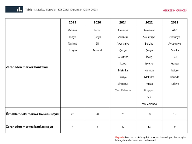 TCMB, 2023 yılında açıkladığı tarihi zararın ardından Merkezin Güncesi portalında paylaştığı yazıda, merkez bankalarının olağanüstü dönemlerde dönemsel zarar açıklamalarının geçici ve istisnai nitelikte olduğunu belirtti. TCMB ekonomistleri, 2023 yılı bilançosunun ardından Merkezin Güncesi portalında "Merkez Bankaları Faaliyetlerinde Kâr- Zarar Olgusu" başlıklı bir yazı kaleme aldı. İlgili yazıda ekonomistler şunları aktardı: “Merkez bankaları kanunda kendilerine verilen görev ve yetkiler ile, ticari bankalardan farklı bir şekilde, kamu yararını gözeten bir çerçevede faaliyet gösterir ve kâr amacı gütmez. Merkez bankalarının yapısının ticari bankalardan farklı olması, iktisat yazınında da yer alan bir konudur. Bu kapsamda değinilen ana husus, merkez bankalarının güçlü bir bilanço veya yüksek kâr gibi finansal hedeflerden ziyade fiyat istikrarını ve finansal istikrarı sağlamaya ve sürdürmeye yönelik amaçlara sahip olmasıdır (Long ve Fisher, 2024). Merkez bankalarının kâr veya zarar yapması hususuna ışık tutan çalışmalarda, merkez bankalarının; Ulusal paranın basılmasında ve ihraç edilmesinde tekel konumunda olmaları sebebiyle genellikle kâr elde etme eğiliminde oldukları, Likidite uyuşmazlığı ve negatif sermaye gibi temel bankacılık problemleri merkez bankaları için söz konusu olmadığından iflas etmeyecekleri, Öte yandan, politika hedeflerini gerçekleştirebilmek amacıyla attıkları adımlar sonucunda belirli dönemlerde zarar edebilecekleri belirtilmiştir. Bu doğrultuda, merkez bankalarının geçici olarak zarar edebilecekleri istisnai dönemler ortaya çıkabilmektedir. 2008 finansal krizi ve Covid-19 pandemisi, bu dönemlere örnek olarak gösterilebilir. Merkez bankalarının zarar etmesi ne anlama gelir? Makroekonomik ve finansal istikrara katkı sağlamak amacıyla yerel para cinsi varlık satın alan bazı merkez bankaları, faiz oranlarının yükseldiği dönemlerde, zarar veya düşük kâr raporlayabiliyor. Net kâr hesaplanırken, tahvillerin piyasa değerindeki değişimi dikkate alan bir muhasebe standardı benimseyen merkez bankalarının kârlılık oranları üzerinde baskı oluşuyor (Bell ve diğerleri, 2023). Bu durum, genellikle varlık alım programları uygulayan gelişmiş ülke merkez bankalarında ortaya çıkıyor. Öte yandan, birçok gelişmekte olan ülke (GOÜ) merkez bankasının da daha önce zarar açıkladıkları biliniyor. Örneğin; Şili, Çekya ve Meksika Merkez Bankaları uzun yıllar negatif özsermayeye sahip bir şekilde faaliyetlerine devam etmiştir (Archer ve Moser-Boehm, 2013). Gelişmiş ülke merkez bankalarından farklı olarak, GOÜ merkez bankalarının kârlılıkları döviz kuru hareketlerinden de önemli ölçüde etkilenebiliyor. GOÜ merkez bankalarının sahip olduğu döviz ve altın cinsinden rezervler bilançoda varlık tarafının büyük bir kısmını oluşturduğu için kur hareketleri kârlılık üzerinde belirgin rol oynayabiliyor (Bell ve diğerleri, 2023). Öte yandan, merkez bankalarının açıkladığı zararlar, merkez bankalarının operasyonlarını etkin bir şekilde devam ettirmesini doğrudan etkilemiyor. Zira merkez bankaları, yükümlülüklerini yerine getirmek için yerel para birimi ihraç edebilir ve yapıları gereği herhangi bir sermaye düzenlemesine tabi değildir. Pandemi sonrası dönemde merkez bankaları Pandemi dönemi, hane halkları, reel sektör ve finansal sektördeki doğrudan ve dolaylı etkileri yanında merkez bankaları ve düzenleyici otoriteler için de zorlayıcı bir tecrübe olarak tarihteki yerini almıştır. Bu süreçte uygulanan genişleyici/destekleyici para politikaları çerçevesinde politika faiz oranları düşürülmüş, finansal piyasalarda kredilerin genişlemesine izin verilmiş, miktarsal genişleme ile merkez bankalarının bilançolarında menkul kıymetler kalemi büyümüştür. 2022 ve 2023 yılları ise, pandeminin doğrudan etkilerinin sönümlenmeye başladığı ancak pandemi döneminde yükselen enflasyon ile mücadelenin en önemli politika önceliklerinden olduğu bir dönem olmuştur. Bu yıllarda gelişmiş ekonomilerde yaşanan parasal sıkılaştırma, pandemi boyunca merkez bankaları aktiflerinde birikmiş olan -çoğunlukla uzun vadeli- menkul kıymetlerin değerini düşürmüş ve merkez bankalarının yükümlülüklerinden doğan faiz giderlerini pek çok örnekte artırmıştır. Bu gelişmeler sonucunda, zarar eden merkez bankalarının sayısında son yıllarda belirgin bir artış gözlenmiştir (Tablo 1). [1] Kaynak: Merkezin Güncesi Faaliyet rapor detaylarına düzenli bir şekilde ulaşılabilen 28 merkez bankasının son beş yıldaki kâr/zarar gelişmeleri incelendiğinde 2019 ve 2020 yıllarında 4, 2021 yılında 10, 2022 yılında 12 merkez bankasının zarar ettiği görülmektedir. 2023 yılına ilişkin şimdiye kadar raporlama yapan 19 ülke arasından 9 ülke zarar açıklamıştır. 2023 yılında ABD, Almanya, Avustralya, Belçika, Fransa, İsviçre, Kanada Merkez Bankaları ile Avrupa Merkez Bankası’nın zarar etmesinin ardındaki başlıca sebep faiz giderlerindeki artıştır. Bu durum faiz oranlarının hızla yükseldiği bir ortamda merkez bankaları varlık-yükümlülük vade yapısının doğal bir neticesidir. Avustralya Merkez Bankası’nın son dönemlerdeki zararında, artan faiz oranları ile birlikte gerçekleşen menkul kıymetlerdeki değer düşüklüğünden doğan zarar ayrıca etkili olmuştur. Keza Rusya, Çekya, Singapur ve Yeni Zelanda Merkez Bankaları’nın da önceki dönemde faiz giderlerindeki artışın yanı sıra menkul kıymetlerindeki değer kaybının etkisiyle zarar açıkladıkları bilinmektedir. Türkiye Cumhuriyet Merkez Bankası da 31 Aralık 2023 tarihinde sona eren 92. Hesap Dönemi Bilançosu’nda 818,2 milyar TL zarar açıklamıştır. Bu za
