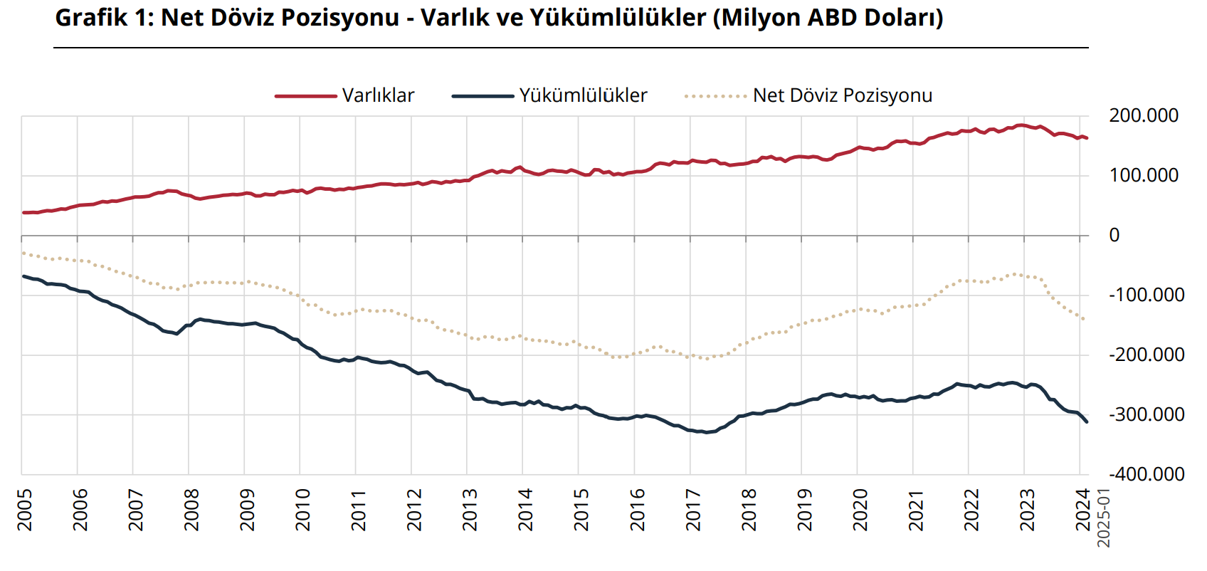 TCMB verilerine göre finansal kesim dışındaki firmaların net döviz açığı 147,9 milyar dolara çıktı. Türkiye Cumhuriyet Merkez Bankası (TCMB), finansal kesim dışındaki firmaların döviz pozisyonlarını açıkladı. TCMB verilerine göre ocakta önceki aya kıyasla finansal kesim dışındaki firmaların döviz varlıkları 2,7 milyar dolar azalırken, yükümlülükler 8,3 milyar dolar arttı. Böylelikle net döviz pozisyonu açığı 11 milyar dolarlık artışla 147,9 milyar dolar olarak gerçekleşti. Kaynak: TCMB