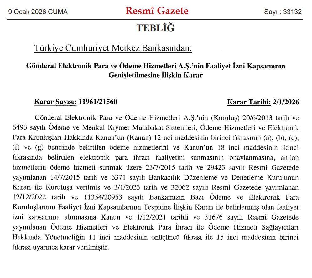 Türkiye Cumhuriyet Merkez Bankası, Gönderal Elektronik Para ve Ödeme Hizmetleri AŞ için verilen faaliyet izninin çerçevesini genişletme kararı aldı. Resmi Gazete'de yayımlanan karara göre, ilgili finansal kuruluşun operasyonel yetkilerinde önemli bir değişikliğe gidildi. Türkiye Cumhuriyet Merkez Bankası, yürütülen incelemeler sonucunda şirketin hizmet alanlarını artırdı. Yeni düzenleme ile birlikte Gönderal Elektronik Para ve Ödeme Hizmetleri AŞ, elektronik para ihracı hizmeti ve ödeme hizmeti sunma yetkisine sahip oldu. Söz konusu karar, 6493 sayılı Ödeme ve Menkul Kıymet Mutabakat Sistemleri, Ödeme Hizmetleri ve Elektronik Para Kuruluşları Hakkında Kanun kapsamında hayata geçti.