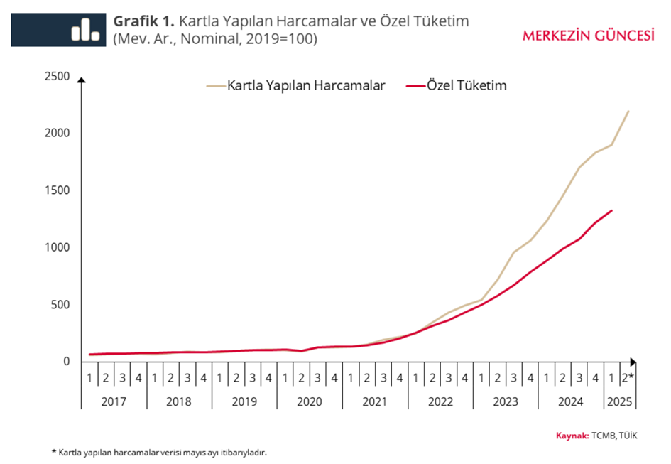 Türkiye Cumhuriyet Merkez Bankası (TCMB) tarafından yayımlanan son blog yazısında, tüketicilerin nakit alışkanlığını bırakarak kartlı alışverişe yöneldiği ve bu durumun kartlı harcamalarda rekor bir artış yaşanmasına sebep olduğu bildirildi. TCMB Yardımcı Ekonomistleri Ece Taşan Özel, Orhun Özel ve Araştırmacı Tahamuhammet Süleyman tarafından kaleme alınan "Kart Kullanım Oranı ve Kartla Yapılan Harcamalar" başlıklı blog yazısı, Merkezin Güncesi sayfasında yayımlandı. Kartla yapılan harcamaların talep dinamiklerini izlemek için değerli bir öncü gösterge niteliği taşıdığı belirtilen yazıda, "Ancak son yıllarda bu harcamalar ivmelenerek özel tüketim harcamalarından ayrışıyor. Bu ayrışmada, tüketicilerin nakitle ödeme yönteminden kartla ödemeye geçmesi etkili. Bu nedenle, kartla harcama verileri üzerinden talep koşullarını değerlendirirken kart kullanım oranındaki artışın etkisinin arındırılması önem taşıyor. Bu etki arındırıldığında ise, kartla yapılan harcamaların son yıllarda, özellikle parasal sıkılaşma sonrasında, daha ılımlı bir artış göstererek özel tüketimin seyriyle daha uyumlu bir görünüm seyrettiği görülüyor." denildi. Konuya ilişkin blog yazısı şöyle oldu: "Kartla yapılan harcamalar yüksek frekanslı olması ve zamanlı bilgi sunması nedeniyle talep koşullarını izlemede yoğun bir şekilde kullanılıyor. Bu gösterge, Gayrisafi Yurtiçi Hasıla (GSYH) içindeki özel tüketim kalemiyle de 2021 yılına kadar oldukça uyumlu bir seyir izliyor. Ancak son yıllarda kartla yapılan harcamalar ivmelenme kaydederek özel tüketimin seyrinden ayrışıyor. Bu ayrışma, kartla yapılan harcamalardaki artışın yalnızca talep gelişmelerine değil, aynı zamanda tüketicilerin ödeme tercihindeki dönüşüme -yani nakitten kartlı ödemeye yönelimin artmasına- bağlı olduğunu akla getiriyor. Bu yazıda, uzun dönemli bir kartla harcama oranı serisi oluşturuyor ve kartla yapılan harcamalar verisinden ödeme tercihlerindeki değişimleri dışlayarak daha sağlıklı bir talep göstergesi elde ediyoruz. Kartla yapılan harcamalar hızlı şekilde artıyor Kartla yapılan harcamalar son dönemde hızlı bir şekilde artıyor. Bu artışta talep dinamiklerinin yanı sıra geleneksel ödeme yöntemi olan nakitten karta geçiş de etkili. Nitekim, güncel çalışmalar kartla ödeme sıklığının kayda değer biçimde arttığını ortaya koyuyor. Bu yükselişte, dijitalleşme ve temassız ödeme sistemlerinin yaygınlaşması gibi teknolojik gelişmelerin yanı sıra enflasyonun yükselerek nakit taşımayı daha maliyetli hale getirmesi temel faktörler olarak karşımıza çıkıyor. Dolayısıyla ödeme alışkanlıklarındaki değişimler, kartlı harcamalar verisini kullanarak talebe ilişkin yorum yaparken kart kullanımındaki artışı da dikkate almamızı gerektiriyor. Kartla yapılan harcamaları bu değişimden arındırmak için de kart kullanım oranını bir zaman serisi olarak tahmin etmemiz gerekiyor. Kart kullanım eğilimlerini ölçebilmek için tüketicilerin toplam harcama düzeyine ilişkin verilere ihtiyaç duyuyoruz. Bu kapsamda akaryakıt sektörü bize önemli bir referans sunuyor. Çünkü bu sektörde hem toplam satış miktarına hem de kartla yapılan harcama verilerine ulaşabiliyoruz. Kartla yapılan akaryakıt harcamalarını toplam akaryakıt satışlarına oranlayarak, sektöre özgü bir kart kullanım oranı hesaplayabiliyoruz. Özellikle 2021 yılı sonrasında bu oranda dikkat çekici bir artış gözleniyor. Diğer sektörlerde de benzer bir eğilimin olduğunu varsayarsak, kartlı harcama verilerini bu tercihin zaman içindeki değişiminden arındırarak, toplam tüketim harcamalarını daha doğru yansıtan bir göstergeye ulaşmamız mümkün hale geliyor. Harcamalardaki artış daha ılımlı Kartla yapılan harcamaları daha sağlıklı bir talep göstergesi olarak takip edebilmek için, öncelikle hesapladığımız kart kullanım oranından faydalanarak kart kullanım tercihi düzeltilmiş serileri elde ediyoruz. Daha sonra bu serileri fiyat etkilerinden arındırarak reel harcama eğilimlerini daha net bir şekilde izleyebiliyoruz. Bu şekilde elde ettiğimiz kart kullanım eğilimi düzeltilmiş ve düzeltilmemiş harcama verileri arasında 2021 sonrasında önemli bir farklılaşma gözlüyoruz. Kart kullanım oranının belirgin bir biçimde yükseldiği bu dönemde kartla yapılan harcamalar güçlü bir ivmelenme kaydediyor. Ancak, kart kullanım tercihi etkisinden arındırılmış olarak bakıldığında ise harcamalardaki artış daha ılımlı. Dahası, bazı dönemsel ayrışmalar dışında, bu düzeltilmiş harcama verisi özel tüketimin seyri ile oldukça uyumlu. Özetle, kartla yapılan harcamalar talep dinamiklerini izlemek için değerli bir öncü gösterge niteliği taşıyor. Ancak son yıllarda bu harcamalar ivmelenerek özel tüketim harcamalarından ayrışıyor. Bu ayrışmada, tüketicilerin nakitle ödeme yönteminden kartla ödemeye geçmesi etkili. Bu nedenle, kartla harcama verileri üzerinden talep koşullarını değerlendirirken kart kullanım oranındaki artışın etkisinin arındırılması önem taşıyor. Bu etki arındırıldığında ise, kartla yapılan harcamaların son yıllarda, özellikle parasal sıkılaşma sonrasında, daha ılımlı bir artış göstererek özel tüketimin seyriyle daha uyumlu bir görünüm seyrettiği görülüyor. GSYH içinde yer alan özel tüketim harcamaları kalemi referans dönemden 60 gün sonra açıklandığı için tüketim talebine ilişkin gecikmeli olarak bilgi sunabiliyor. Kart kullanım oranını hesaplarken kartla yapılan akaryakıt harcamalarını toplam akaryakıt satışlarına böldük. Toplam akaryakıt satışlarını bulmak için de günlük frekansta, istasyon ve yakıt türü ayrımında akaryakıt verisin