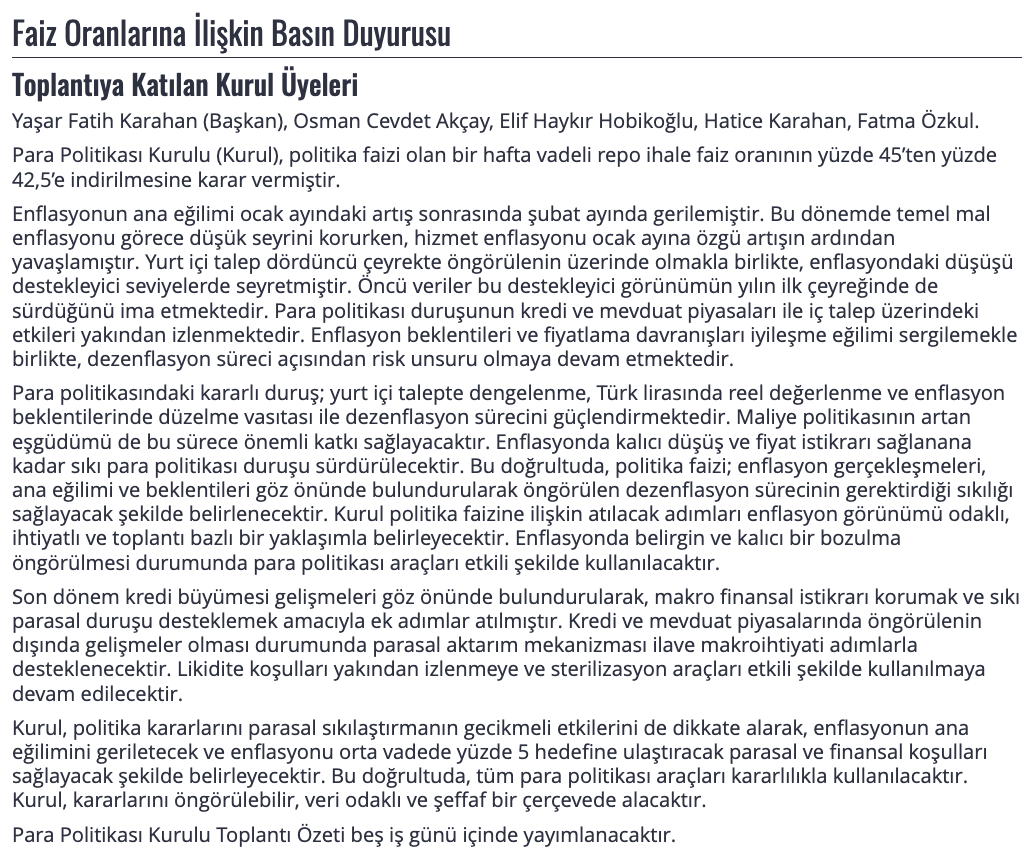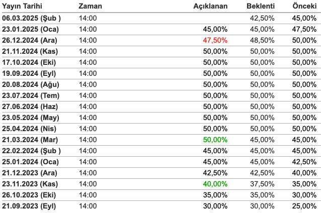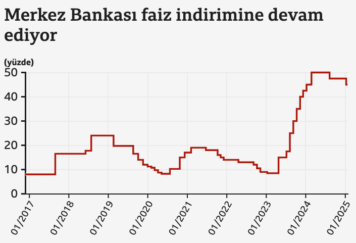 Merkez Bankası, Para Politikası Kurulu toplantısının ardından yılın ikinci faiz kararını açıkladı. Türkiye Cumhuriyet Merkez Bankası (TCMB) son iki toplantısındaki geleneğini sürdürdü ve faiz indirimlerine 250 baz puan ile devam etti! Politika faizi yüzde 45'ten yüzde 42.5'e çekildi, aşağıdaki açıklamayı yayımladı. ''Para Politikası Kurulu (Kurul), politika faizi olan bir hafta vadeli repo ihale faiz oranının yüzde 45’ten yüzde 42,5’e indirilmesine karar vermiştir. Enflasyonun ana eğilimi ocak ayındaki artış sonrasında şubat ayında gerilemiştir. Bu dönemde temel mal enflasyonu görece düşük seyrini korurken, hizmet enflasyonu ocak ayına özgü artışın ardından yavaşlamıştır. Yurt içi talep dördüncü çeyrekte öngörülenin üzerinde olmakla birlikte, enflasyondaki düşüşü destekleyici seviyelerde seyretmiştir. Öncü veriler bu destekleyici görünümün yılın ilk çeyreğinde de sürdüğünü ima etmektedir. Para politikası duruşunun kredi ve mevduat piyasaları ile iç talep üzerindeki etkileri yakından izlenmektedir. Enflasyon beklentileri ve fiyatlama davranışları iyileşme eğilimi sergilemekle birlikte, dezenflasyon süreci açısından risk unsuru olmaya devam etmektedir. Para politikasındaki kararlı duruş; yurt içi talepte dengelenme, Türk lirasında reel değerlenme ve enflasyon beklentilerinde düzelme vasıtası ile dezenflasyon sürecini güçlendirmektedir. Maliye politikasının artan eşgüdümü de bu sürece önemli katkı sağlayacaktır. Enflasyonda kalıcı düşüş ve fiyat istikrarı sağlanana kadar sıkı para politikası duruşu sürdürülecektir. Bu doğrultuda, politika faizi; enflasyon gerçekleşmeleri, ana eğilimi ve beklentileri göz önünde bulundurularak öngörülen dezenflasyon sürecinin gerektirdiği sıkılığı sağlayacak şekilde belirlenecektir. Kurul politika faizine ilişkin atılacak adımları enflasyon görünümü odaklı, ihtiyatlı ve toplantı bazlı bir yaklaşımla belirleyecektir. Enflasyonda belirgin ve kalıcı bir bozulma öngörülmesi durumunda para politikası araçları etkili şekilde kullanılacaktır. Son dönem kredi büyümesi gelişmeleri göz önünde bulundurularak, makro finansal istikrarı korumak ve sıkı parasal duruşu desteklemek amacıyla ek adımlar atılmıştır. Kredi ve mevduat piyasalarında öngörülenin dışında gelişmeler olması durumunda parasal aktarım mekanizması ilave makroihtiyati adımlarla desteklenecektir. Likidite koşulları yakından izlenmeye ve sterilizasyon araçları etkili şekilde kullanılmaya devam edilecektir. Kurul, politika kararlarını parasal sıkılaştırmanın gecikmeli etkilerini de dikkate alarak, enflasyonun ana eğilimini geriletecek ve enflasyonu orta vadede yüzde 5 hedefine ulaştıracak parasal ve finansal koşulları sağlayacak şekilde belirleyecektir. Bu doğrultuda, tüm para politikası araçları kararlılıkla kullanılacaktır. Kurul, kararlarını öngörülebilir, veri odaklı ve şeffaf bir çerçevede alacaktır. Para Politikası Kurulu Toplantı Özeti beş iş günü içinde yayımlanacaktır.'' Ayrıntılar geliyor ... Piyasalar nasıl bir adım öngörmüş, beklentiler ne yönde şekillenmişti? Türkiye Cumhuriyet Merkez Bankası (TCMB) Para Politikası Kurulu (PPK) tarafından açıklanan faiz kararının öncesinde ekonomistler, enflasyondaki düşüşün etkisiyle faiz indirimi beklentisini gündeme getirmiş, daha önceki toplantılarda üst üste iki kez faiz indirimine giden Merkez Bankası'nın bu eğilimi devam ettireceği öngörülmüştü. Ekonomistler, TCMB’nin Aralık 2024 ve Ocak 2025 toplantılarında aldığı faiz indirimi kararlarının ardından Mart ayında da benzer bir adım atacağını değerlendirdi. 26 Aralık 2024’te gerçekleştirilen toplantıda 22 ay aranın ardından ilk kez faiz indirimi yapılmış ve politika faizi 250 baz puan düşürülerek yüzde 50’den yüzde 47,5 seviyesine çekilmişti. 23 Ocak 2025’te gerçekleşen bir sonraki toplantıda ise faiz bir kez daha aşağı yönlü revize edilerek yüzde 45’e düşürülmüştü. Kurul, faiz indirimi kararlarını açıklarken sıkı para politikasının enflasyonda kalıcı düşüş sağlanana kadar devam ettirileceğini vurgulamış, “Bu doğrultuda politika faizi, enflasyon gerçekleşmeleri, ana eğilimi ve beklentileri göz önünde bulundurularak öngörülen dezenflasyon sürecinin gerektirdiği sıklığı sağlayacak şekilde belirlenecektir” ifadelerine yer vermişti. Mart ayındaki faiz kararı öncesinde enflasyon verileri de yakından takip edildi. Türkiye İstatistik Kurumu (TÜİK) tarafından açıklanan Şubat 2025 verilerine göre enflasyon aylık bazda yüzde 2,27 olurken yıllık bazda 20 ay sonra ilk kez yüzde 40’ın altına inerek yüzde 39 seviyesine geriledi. Buna karşın, bağımsız enflasyon araştırmaları yürüten Enflasyon Araştırma Grubu (ENAG) verilerine göre, Şubat ayında enflasyon aylık yüzde 3,37, yıllık ise yüzde 79,51 olarak ölçüldü. Anadolu Ajansı’nın gerçekleştirdiği anket sonuçları, ekonomistlerin TCMB’den 250 baz puanlık faiz indirimi beklentisi içinde olduğunu gösterdi. Bu senaryoya göre, politika faizinin yüzde 45’ten yüzde 42,5 seviyesine çekileceği tahmin edildi. Eski Merkez Bankası Başekonomisti Prof. Dr. Hakan Kara da sosyal medya hesabında yaptığı paylaşımda bu görüşü destekleyerek “Yarınki TCMB toplantısı için gönlümden geçen 200 baz puan, tahminim ise 250 baz puan indirim. 250’den fazla olur mu? Böyle bir karar beklentileri bozar ve döviz rezervi kaybına neden olur bu nedenle yapılma olasılığı çok düşük” ifadelerini kullandı. Geçtiğimiz yıl faiz politikalarında keskin değişimler yaşanmıştı. 2022 Ekim ayında TÜİK verilerine göre yüzde 85,5 seviyesine ulaşan enflasyon sonrası düşük faiz politikasını ter