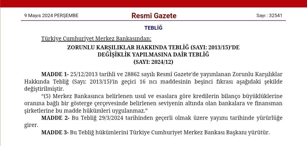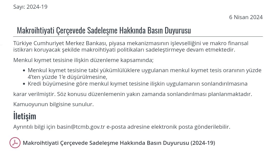 Resmi Gazete'de yayımlanan karar ile Türkiye Cumhuriyet Merkez Bankası (TCMB), menkul kıymet tesisine ilişkin düzenlemeyi yürürlükten kaldırdı. TCMB'nin makroihtiyati çerçevede sadeleşmeye ilişkin duyurusunda, Merkez Bankası'nın, piyasa mekanizmasının işlevselliğini artıracak ve makro finansal istikrarı güçlendirecek şekilde makroihtiyati politikaları sadeleştirmeye devam ettiği belirtildi. Duyuruda, "6 Nisan 2024 tarihli basın duyurusunda, menkul kıymet tesisi düzenlemesine yönelik sadeleşme adımları duyurulmuş ve söz konusu düzenlemenin yakın zamanda sonlandırılmasının planlandığı açıklanmıştı. Resmi Gazete'de bugün yayımlanan tebliğ ile menkul kıymet tesisine ilişkin düzenleme yürürlükten kaldırılmıştır." denildi. TCMB'nin 6 Nisan'daki duyurusunda, menkul kıymet tesisine tabi yükümlülüklere uygulanan menkul kıymet tesis oranının yüzde 4'ten yüzde 1'e düşürülmesine, kredi büyümesine göre menkul kıymet tesisine ilişkin uygulamanın da sonlandırılmasına karar verildiği bildirilmişti. Kaynak: TCMB Menkul kıymet tesisi ise bankaların döviz cinsinden yükümlülüklerini azaltmak ve Türk lirasının değerini korumak için uygulanmaya başlamıştı. Zorunlu karşılık uygulaması da değişti Öte yandan, Resmi Gazete’de “Zorunlu Karşılıklar Hakkında Tebliğ’de Değişiklik Yapılmasına Dair Tebliğ” yayımlandı. Tebliğde, “Merkez Bankasınca belirlenen usul ve esaslara göre kredilerin bilanço büyüklüklerine oranına bağlı bir gösterge çerçevesinde belirlenen seviyenin altında olan bankalara ve finansman şirketlerine bu madde hükümleri uygulanmaz” ifadesi yer aldı. Kaynak: Resmi Gazete Ne anlama geliyor? Uzmanlar, söz konusu düzenlemelerin sadeleşme yönünde alınan teknik kararlar olduğunu belirtti. Menkul kıymet tesisi uygulaması ile bankaların belirli derece hazine bonosu ve devlet tahvili alması gerekiyordu. Bankalar, uzun vadeli Hazine tahvillerini enflasyonun altında bir getiri ile alıyordu. Uzmanlara göre bankalar, zarar edecekleri olasılık içerisinde en iyisini seçmek zorunda kalıyordu. Düzenleme bankaların aktif-pasif yönetimine olumlu yansıyacak. Zorunlu karşılık düzenlemesi ise kredilendirme mekanizmasının daha etkin çalışmasını sağlayacak. Bankaların daha etkin çalışacak piyasa mekanizması ile normalleşeceğini belirten uzmanlar, sadeleşme adımlarının fiyat dengelenmesi ve kredi aktarım mekanizması için olumlu olacağını kaydetti. [news_id:732653]