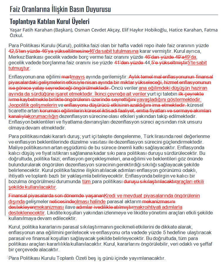 Haziran ayı toplantısında politika faizini beklentilere uygun şekilde yüzde 46 seviyesinde sabit bırakan TCMB, PPK sonrası yayımladığı karar metninde 3 önemli değişikliğe gitti. İşte TCMB’nin karar metninde yaptığı revizyonlar.. TCMB Para Politikası Kurulu (PPK), politika faizi olan bir hafta vadeli repo ihale faiz oranını yüzde 46 seviyesinde sabit bıraktı. Türkiye Cumhuriyet Merkez Bankası (TCMB), politika faizinin yüzde 46’da sabit tutulduğu karara eşlik eden açıklamalarında ise hem metnin tonunda hem de kullanılan dilde önemli revizyonlar yaptı. Sıkılaştırma ifadesi çıkarıldı Buna göre önceki metinde yer alan "Aylık temel enflasyonun finansal piyasalarındaki gelişmelerin etkisiyle nisan ayında bir miktar yükseleceği" ve "yurt içi talebin öngörülenin üzerinde seyrettiği" ifadeleri çıkarılarak, yurt içi talebin yavaşladığına vurgu yapıldı. Önceki metinde yer almayan jeopolitik gelişmelerin takip edileceği ifadesi de Orta Doğu’da yaşanan gerilim sonrası bu metne eklenenler arasında yer aldı. Öte yandan bir önceki metinde gerekirse parasal duruşunu sıkılaştırılacağını bildiren TCMB, yeni paylaştığı metinde para politikası araçlarını etkili şekilde kullanacağını aktardı. TCMB'nin PPK metninde yaptığı değişiklikler şunlar oldu: Kaynak: e507 [news_id:775900]