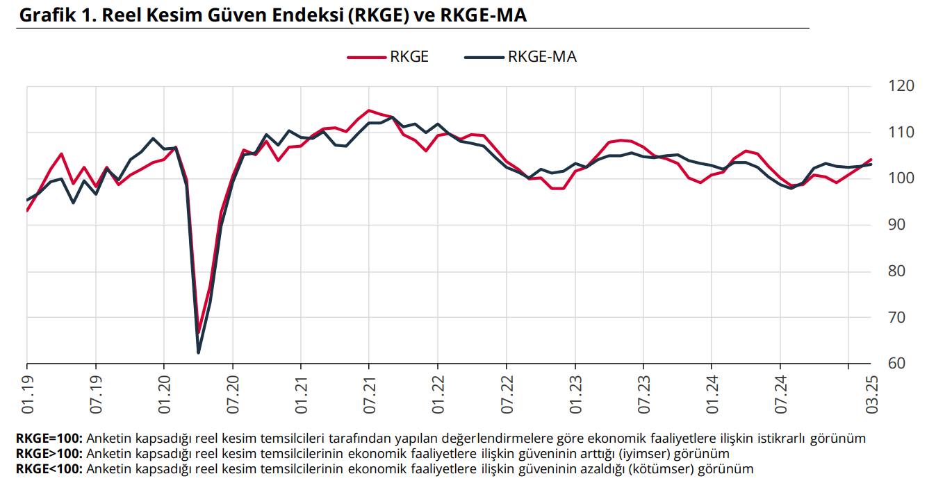 TCMB verilerine göre reel kesim güveni 103,2 seviyesine yükselerek Kasım 2024'ten bu yana en yüksek düzeye çıktı. Türkiye Cumhuriyet Merkez Bankası (TCMB), mart ayı reel kesim güven endeksi verilerini açıkladı. 2025 yılı Mart ayında mevsimsellikten arındırılmış Reel Kesim Güven Endeksi (RKGE-MA), bir önceki aya göre 0,4 puan artarak 103,2 seviyesinde gerçekleşti. Endeksi oluşturan anket sorularına ait yayılma endeksleri incelendiğinde, genel gidişat, gelecek üç aydaki üretim hacmi, mevcut mamul mal stoku, gelecek üç aydaki toplam istihdam, mevcut toplam sipariş miktarı ve son üç aydaki toplam sipariş miktarına ilişkin değerlendirmeler endeksi artış yönünde etkilerken, gelecek üç aydaki ihracat sipariş miktarı ve sabit sermaye yatırım harcamasına ilişkin değerlendirmeler endeksi azalış yönünde etkiledi. Mevsimsellikten arındırılmamış Reel Kesim Güven Endeksi (RKGE) bir önceki aya göre 1,7 puan artarak 104,1 seviyesinde gerçekleşti. Kaynak: TCMB [news_id:766787]