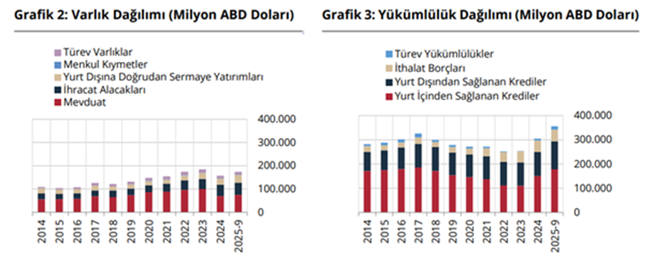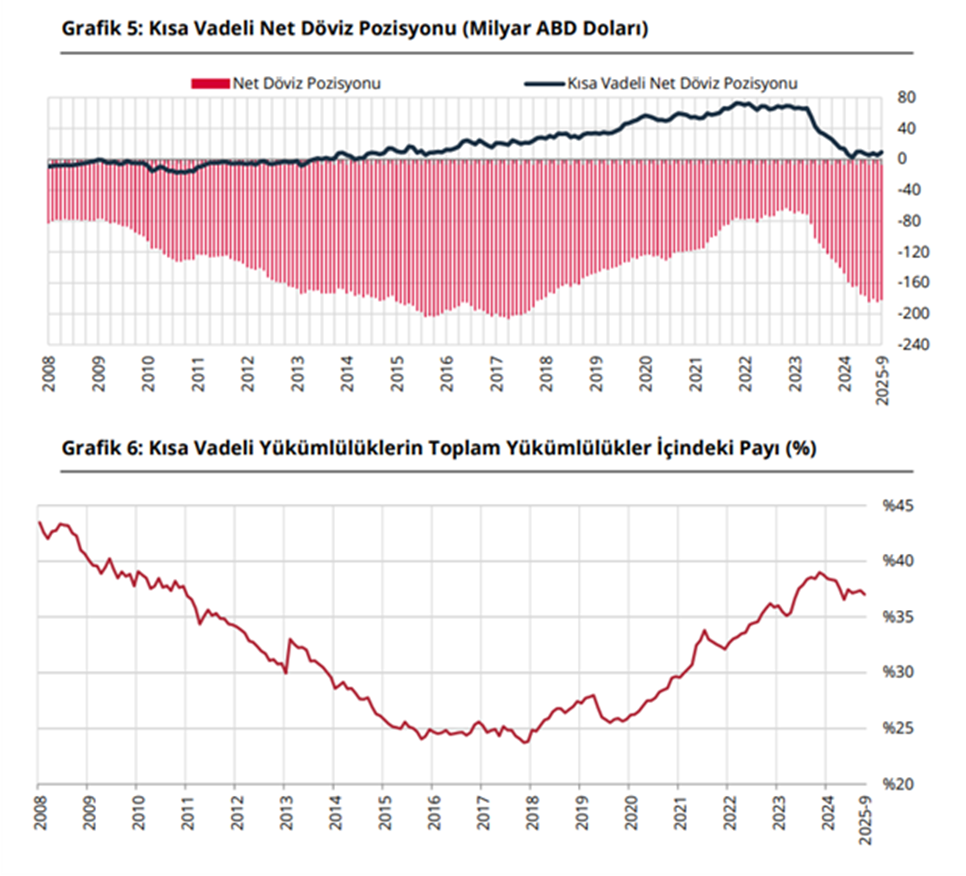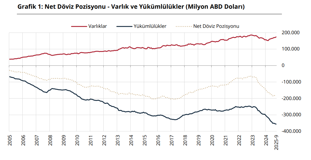 TCMB verilerine göre finansal kesim dışındaki firmaların net döviz pozisyonu açığı eylülde bir önceki aya göre 979 milyon dolar azalarak 182,37 milyar dolara indi. Türkiye Cumhuriyet Merkez Bankası (TCMB), eylül ayına ilişkin finansal kesim dışındaki firmaların döviz varlık ve yükümlülük verilerini yayımladı. İlgili verilere göre varlıklar ağustosa göre 3,368 milyar dolar artarken yükümlülükler 2,389 milyar dolar yükseldi. Net döviz pozisyonu açığı ise 182,366 milyar dolar olarak kaydedildi ve bir önceki aya göre 979 milyon dolar iyileşme gösterdi. Varlıkların dağılımında yurt içi bankalardaki mevduatlar 2,1 milyar dolar, yurt dışına doğrudan sermaye yatırımları 850 milyon dolar, türev varlıklar 619 milyon dolar ve menkul kıymetler 126 milyon dolar arttı. İhracat alacakları ise 342 milyon dolar geriledi. Yükümlülük tarafında yurt içinden sağlanan nakdi krediler 2,14 milyar dolar, yurt dışından alınan krediler 552 milyon dolar ve türev yükümlülükler 388 milyon dolar yükselirken ithalat borçları 691 milyon dolar azaldı. Vade yapısına bakıldığında, yurt içi kısa vadeli krediler 319 milyon dolar, uzun vadeli krediler ise 1,82 milyar dolar arttı. Yurt dışı kredilerde kısa vadeli borçlar 544 milyon dolar gerilerken uzun vadeli borçlar 405 milyon dolar yükseldi. Eylül itibarıyla kısa vadeli varlıklar 140,992 milyar dolar, kısa vadeli yükümlülükler ise 131,912 milyar dolar oldu. Böylece kısa vadeli net döviz pozisyonu 9,08 milyar dolar fazla verdi ve bir ayda 2,269 milyon dolar iyileşme gösterdi. Kısa vadeli yükümlülüklerin toplam yükümlülükler içindeki payı yüzde 37 olarak gerçekleşti. Kaynak: TCMB