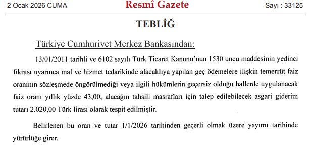 TCMB, ticari işletmelerde geç ödemelerde temerrüt faiz oranını yüzde 43 olarak belirledi. Türkiye Cumhuriyet Merkez Bankası (TCMB), ticari alacaklara ilişkin uygulanacak temerrüt faizi oranı ile tahsil masraflarına yönelik tutarları belirledi. Resmi Gazete’de yayımlanan tebliğe göre, mal ve hizmet tedarikinde alacaklıya yapılan geç ödemeler ilişkin temerrüt faiz oranının sözleşmede öngörülmediği veya ilgili hükümlerin geçersiz olduğu hallerde uygulanacak faiz oranını yüzde 43 olarak açıkladı. Söz konusu oran 2025 yılı başında yüzde 53,25 seviyesindeydi. Düzenleme kapsamında, alacaklının borcun tahsili için borçludan talep edebileceği asgari gider tutarı, 2 bin 20 TL olarak belirlendi. Bu tutar ise geçtiğimiz yılın başında bin 450 TL olarak belirlenmişti. Belirlenen bu oran ve tutarın 1 Ocak 2026 tarihinden itibaren geçerli olmak üzere yayımlandığı tarihte yürürlüğe gireceği açıklandı. Kaynak: Resmi Gazete