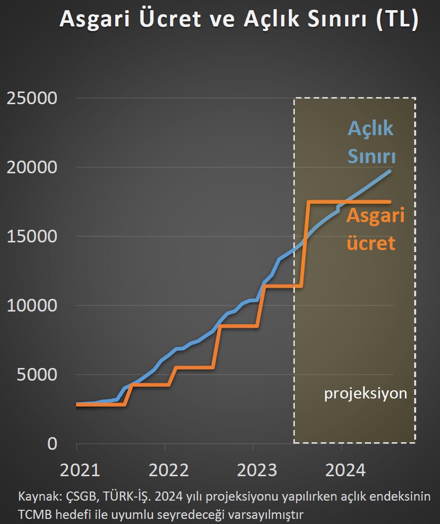 Milyonlarca çalışan asgari ücrete yapılacak zam oranını beklerken, Merkez Bankası eski Başekonomisti Hakan Kara da asgari ücrete yönelik hesaplamasının sonuçlarını paylaştı. Kritik asgari ücret görüşmeleri öncesinde Cumhurbaşkanı Recep Tayyip Erdoğan, asgari ücrete tek zam sinyali vererek, "Asgari ücret artışı zaten biliyorsunuz yıl içinde bir kezdir. Bir kez verilecek zamla bu iş biter" ifadelerini kullanmıştı. [news_id:716760] Cumhurbaşkanı Erdoğan’ın bu söylemleri ise asgari ücrette tahminlerin yeniden değişmesine yol açtı. TCMB eski Başekonomisti Hakan Kara, daha önce asgari ücrete yapılmasını beklediği yüzde 40'lık öngörüsünün ardından asgari ücretin yılda bir kez artması halinde kaç olabileceğini hesapladı. Buna göre Hakan Kara, ücret artış sıklığının tekrar yılda bire indirilmesi durumunda, TCMB’nin %36 enflasyon tahminini esas aldığında; 2024'te ortalamada ilave alım gücü kaybı yaratmayacak asgari ücretin 17.500 TL (%53,5) olacağını duyurdu. Kara, hesaplamasının detaylarını ise şöyle paylaştı: “Bu hesabı nasıl yaptığıma ilişkin çok soru geldi. TÜRK-İŞ'in ölçtüğü açlık sınırının 2024'te %36 (TCMB tahmini) artacağını varsaydım (daha yüksek de olabilir). Yılda bir kez ayarlama yapılacaksa asgari ücreti 2024 ortalama açlık sınırına eşitleyen değer yaklaşık 17.500 TL oluyor.” Kaynak: Hakan Kara-X [news_id:716882]