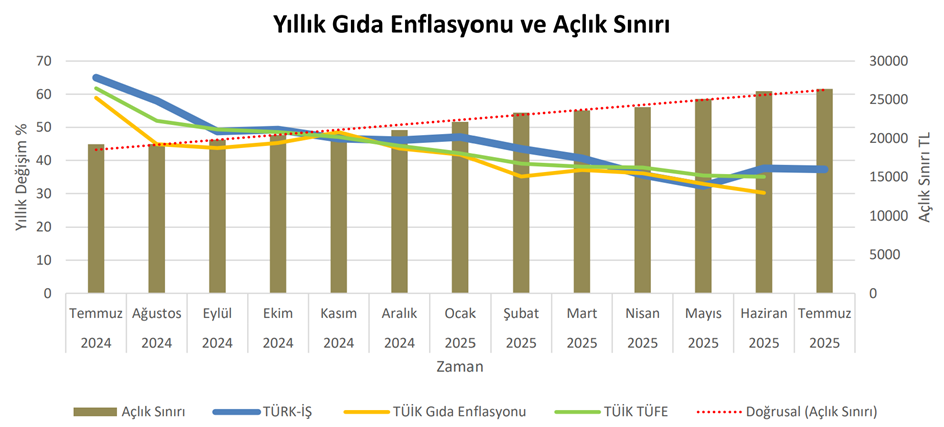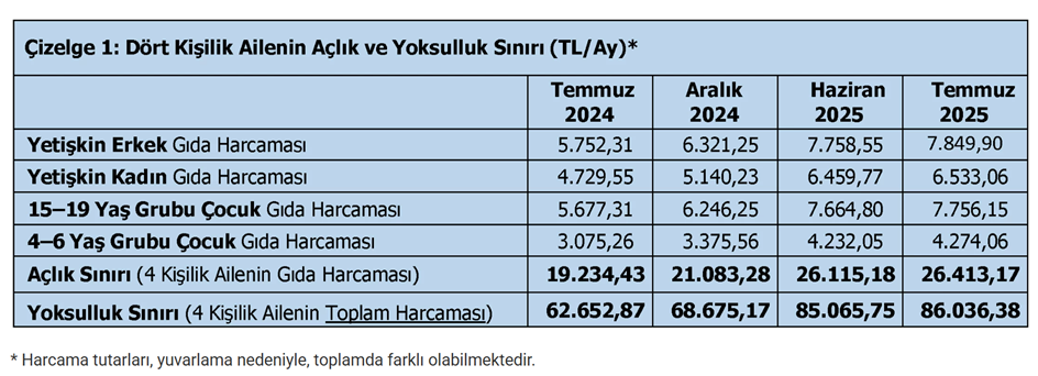 TÜRK-İŞ’in araştırmasına göre temmuz ayında yoksulluk sınırı 86 bin liranın üzerine çıktı. TÜRK-İŞ, açlık ve yoksulluk sınırı araştırmasının temmuz ayı sonuçlarını açıkladı. İlgili sonuçlara göre Ankara’da yaşayan dört kişilik bir ailenin sağlıklı, dengeli ve yeterli beslenebilmesi için yapması gereken aylık gıda harcaması tutarı (açlık sınırı) 26.413 TL’ye yükseldi. Gıda harcaması ile giyim, konut (kira, elektrik, su, yakıt), ulaşım, eğitim, sağlık ve benzeri ihtiyaçlar için yapılması zorunlu diğer aylık harcamalarının toplam tutarı ise (yoksulluk sınırı) 86.036 TL’ye çıktı. Bekâr bir çalışanın yaşama maliyeti de aylık 33.982 TL’ye ulaştı. Kaynak: Türk-İş Gıda enflasyonu TÜRK-İŞ’ in verilerine göre “gıda enflasyonu” verilerindeki değişim ise Temmuz 2025’te şöyle oldu: 📌 Ankara’da yaşayan dört kişilik bir ailenin “gıda için” yapması gereken asgari harcama tutarındaki artış bir önceki aya göre yüzde 1,14 oranında gerçekleşti. 📌 On iki aylık değişim oranı yüzde 37,32 oldu. 📌 Yıllık ortalama artış ise yüzde 42,60 olarak gerçekleşti. 📌 Yılın ilk yedi ayındaki değişim oranı yüzde 25,28 olarak gerçekleşti. Kaynak: Türk-İş [news_id:780134]