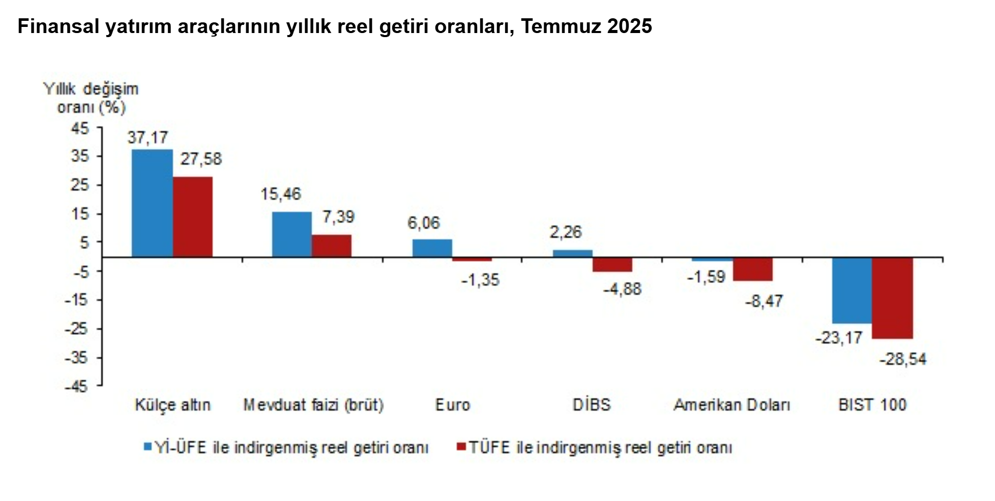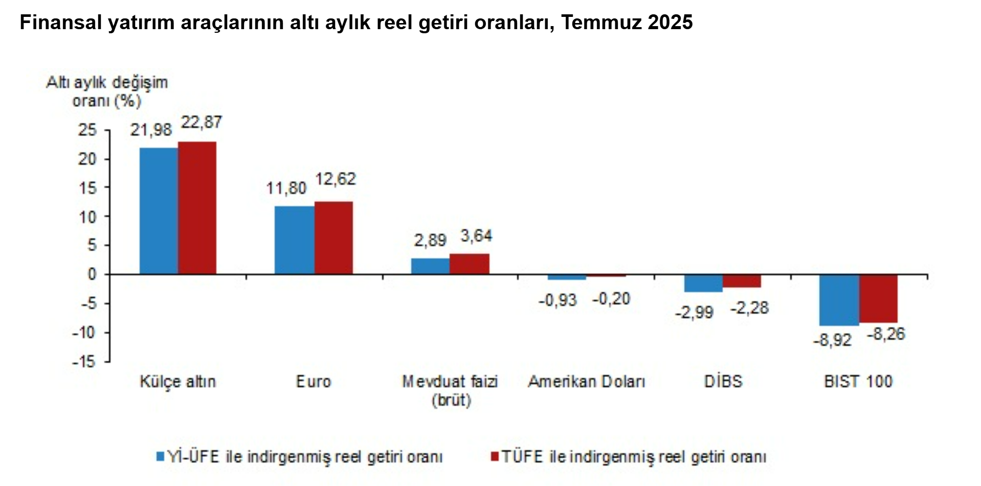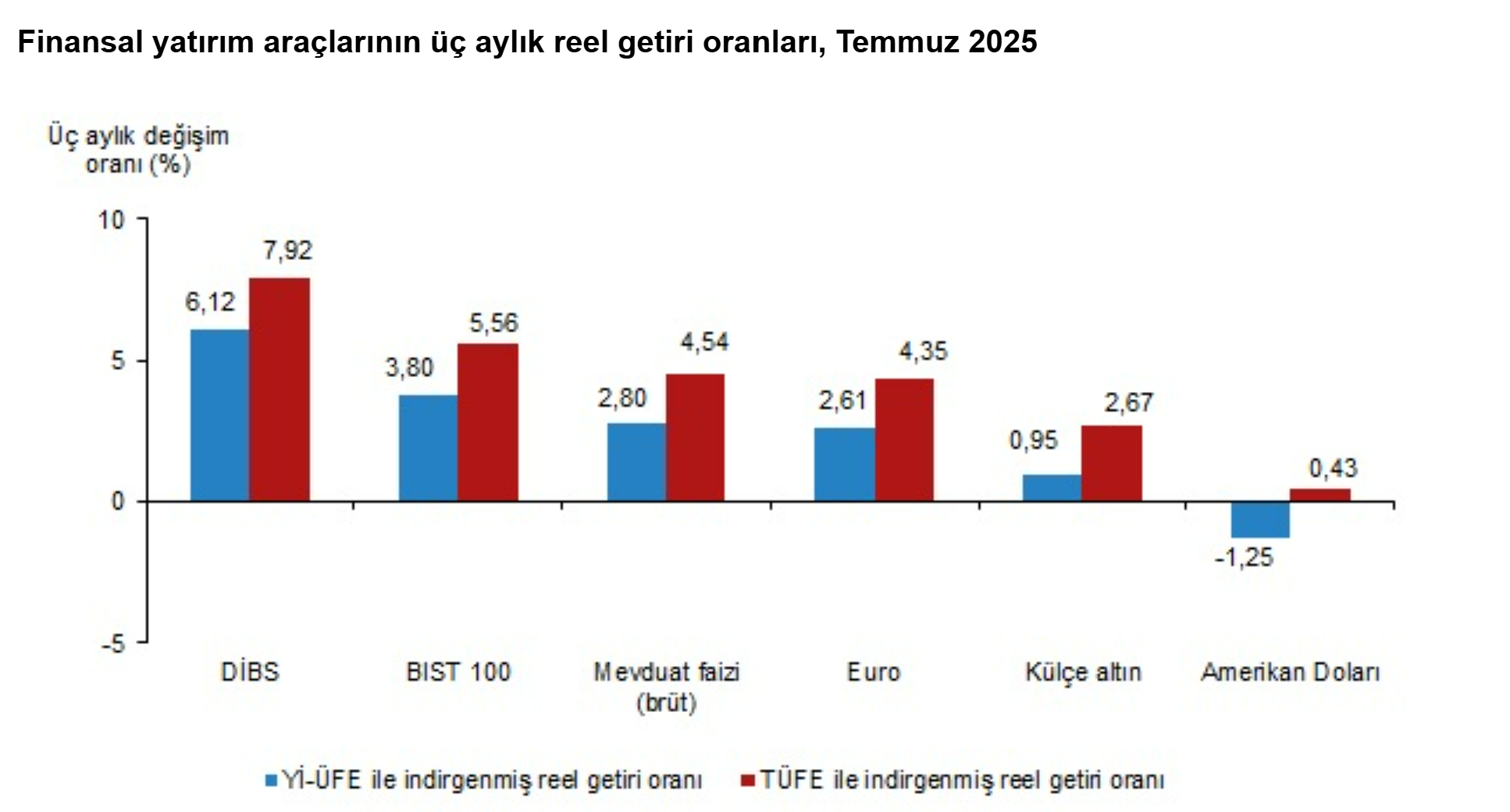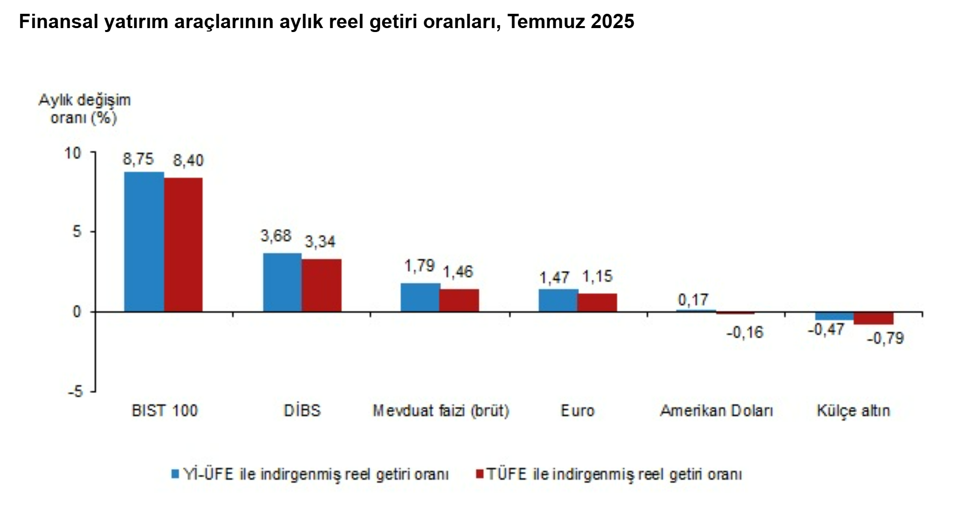Türkiye İstatistik Kurumu (TÜİK), temmuz ayında enflasyon ile indirgendiğinde en yüksek reel getirinin BIST 100 endeksinde olduğunu açıkladı. Türkiye İstatistik Kurumu, temmuz ayına ilişkin finansal yatırım araçlarının reel getiri oranlarını açıkladı. Aylık en yüksek reel getiri, yurt içi üretici fiyat endeksi (Yİ-ÜFE) ile indirgendiğinde %8,75, tüketici fiyat endeksi (TÜFE) ile indirgendiğinde ise %8,40 oranlarıyla BIST 100 endeksinde gerçekleşti. Yİ-ÜFE ile indirgendiğinde; yatırım araçlarından Devlet İç Borçlanma Senetleri (DİBS) %3,68, mevduat faizi (brüt) %1,79, Euro %1,47 ve Amerikan Doları %0,17 oranlarında yatırımcısına reel getiri sağlarken; külçe altın %0,47 oranında yatırımcısına kaybettirdi. TÜFE ile indirgendiğinde ise Devlet İç Borçlanma Senetleri (DİBS) %3,34, mevduat faizi (brüt) %1,46 ve Euro %1,15 oranlarında yatırımcısına reel getiri sağlarken; Amerikan Doları %0,16 ve külçe altın %0,79 oranlarında yatırımcısına kaybettirdi. DİBS, üç aylık değerlendirmede; Yİ-ÜFE ile indirgendiğinde %6,12, TÜFE ile indirgendiğinde ise %7,92 oranlarında yatırımcısına en yüksek reel getiri sağlayan yatırım aracı oldu. Aynı dönemde Amerikan Doları, Yİ-ÜFE ile indirgendiğinde %1,25 oranında yatırımcısına en çok kaybettiren yatırım aracı oldu. Amerikan Doları TÜFE ile indirgendiğinde ise %0,43 oranında yatırımcısına en az reel getiri sağlayan yatırım aracı oldu. Altı aylık değerlendirmeye göre külçe altın; Yİ-ÜFE ile indirgendiğinde %21,98, TÜFE ile indirgendiğinde ise %22,87 oranlarında yatırımcısına en yüksek reel getiri sağlayan yatırım aracı olurken; aynı dönemde BIST 100 endeksi, Yİ-ÜFE ile indirgendiğinde %8,92, TÜFE ile indirgendiğinde ise %8,26 oranlarında yatırımcısına en çok kaybettiren yatırım aracı oldu. Finansal yatırım araçları yıllık olarak değerlendirildiğinde külçe altın; Yİ-ÜFE ile indirgendiğinde %37,17, TÜFE ile indirgendiğinde ise %27,58 oranlarında yatırımcısına en yüksek reel getiri sağlayan yatırım aracı oldu. Yıllık değerlendirmede, Yİ-ÜFE ile indirgendiğinde; yatırım araçlarından mevduat faizi (brüt) %15,46, Euro %6,06 ve DİBS %2,26 oranlarında yatırımcısına reel getiri sağlarken; Amerikan Doları %1,59 ve BIST 100 endeksi %23,17 oranlarında yatırımcısına kaybettirdi. TÜFE ile indirgendiğinde ise mevduat faizi (brüt) %7,39 oranında yatırımcısına reel getiri sağlarken; Euro %1,35, DİBS %4,88, Amerikan Doları %8,47 ve BIST 100 endeksi %28,54 oranlarında yatırımcısına kaybettirdi.