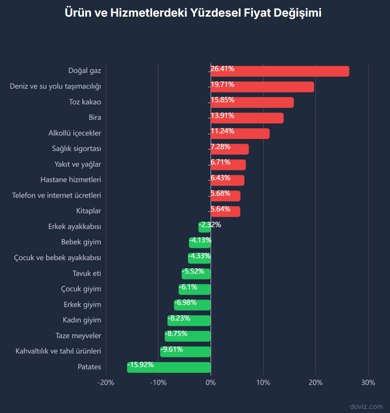 TÜİK verilerine göre tüketici fiyatları bazında temmuz ayında en yüksek fiyat artışı yüzde 26,41 ile doğal gaz ve ilgili abonelik ücretlerinde yaşandı. Aynı dönemde en fazla ucuzlayan ürün ise yüzde 15,92 ile patates oldu. Türkiye İstatistik Kurumu (TÜİK) temmuz ayında fiyatı en çok artan ve azalan ürünleri açıkladı. TÜİK verilerine göre temmuz ayında en yüksek fiyat artışı yüzde 26,41 ile doğal gaz ve ilgili abonelik ücretlerinde gerçekleşti. Doğal gaz ve abonelik ücretlerindeki artışı, yüzde 19,71 ile deniz ve yurt içi su yolu ile yolcu taşımacılığı, yüzde 15,85 ile toz kakao izledi. Temmuz ayında fiyat artışı kaydedilen diğer ürünler arasında yüzde 13,91 ile bira, yüzde 11,24 ile alkollü içecekler (rakı, viski, votka vb.), yüzde 7,28 ile sağlık sigortası ve yüzde 6,71 ile kişisel ulaştırma araçlarının yakıt ve yağları (benzin, motorin, motor yağı) yer aldı. Fiyatı en çok düşen ürünler Geçen ay en fazla fiyat düşüşü yüzde 15,92 ile patateste görüldü. Patatesteki bu düşüşü yüzde 9,61 ile kahvaltılık tahıl ürünleri, yüzde 8,75 ile taze meyveler, yüzde 8,23 ile kadın giyim ve yüzde 6,98 ile erkek giyim izledi.