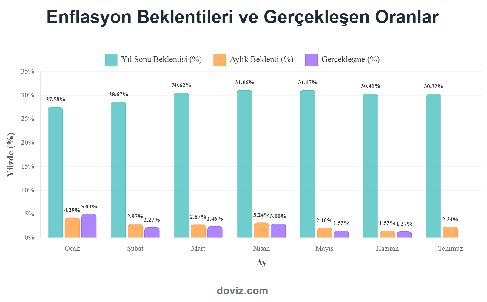 TÜİK'in gelecek hafta açıklayacağı temmuz ayına yönelik enflasyon rakamları için 17 ekonomistten yeni tahmin geldi. Ekonomistler, temmuz ayında Tüketici Fiyat Endeksi'nin (TÜFE) yüzde 2,34 artacağını öngördü. AA Finans tarafından 17 ekonomistin katılımıyla gerçekleşen temmuz ayı enflasyon beklenti anketi sonuçlandı. İlgili anketin sonuçlarına göre ekonomistlerin Tüketici Fiyat Endeksi'nde (TÜFE) temmuz ayında ortalama yüzde 2,34 oranında artış beklediği görüldü. Ankete katılan ekonomistlerin temmuz ayına ilişkin tahminleri yüzde 1,65 ile yüzde 2,90 aralığında değişiklik gösterdi. Ortalama tahmine göre yıllık bazda enflasyonun ise yüzde 35,05 seviyesinden yüzde 33,90 düzeyine gerileyeceği öngörüldü. Tüketici Fiyat Endeksi, haziranda aylık bazda yüzde 1,37 artış kaydetmişti. 2025 yılında aylar itibarıyla ekonomistlerin enflasyon beklentileri ve gerçekleşmeleri ise şöyle oldu: